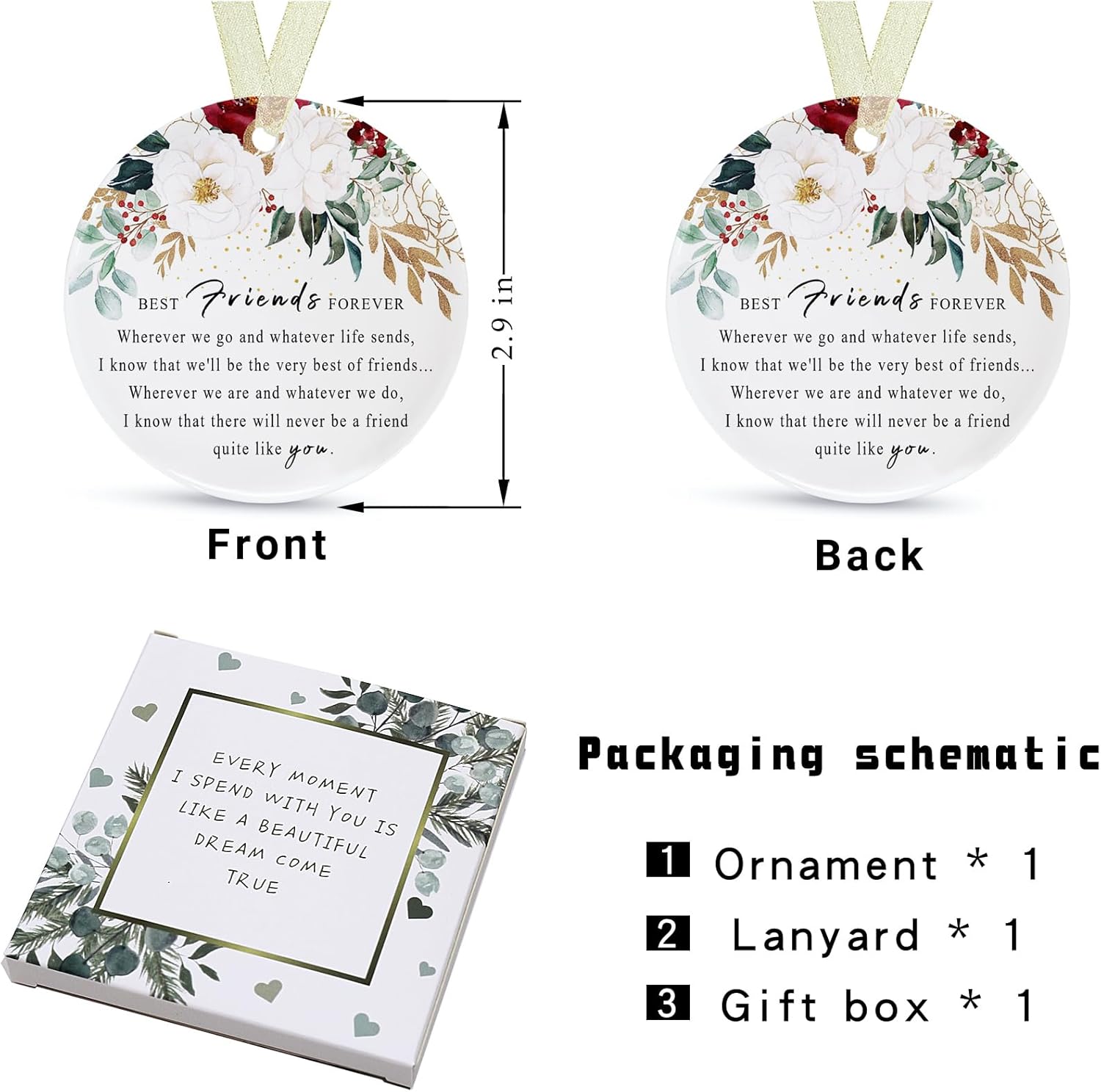 - đŒăPerfect and delicate sizeăThis is a friend memory ornament with a diameter of 2.9 inches and a thickness of only 0.18 inches. The product includes: a round friend ornamentt*1, a gift box*1 and a lanyard*1. The gift box comes with it makes it easy for you to give the best friend ever gifts directly to family and friends and other special people in your life, and the lanyard that comes with it helps to hang it easily on the Christmas tree or anywhere you want.