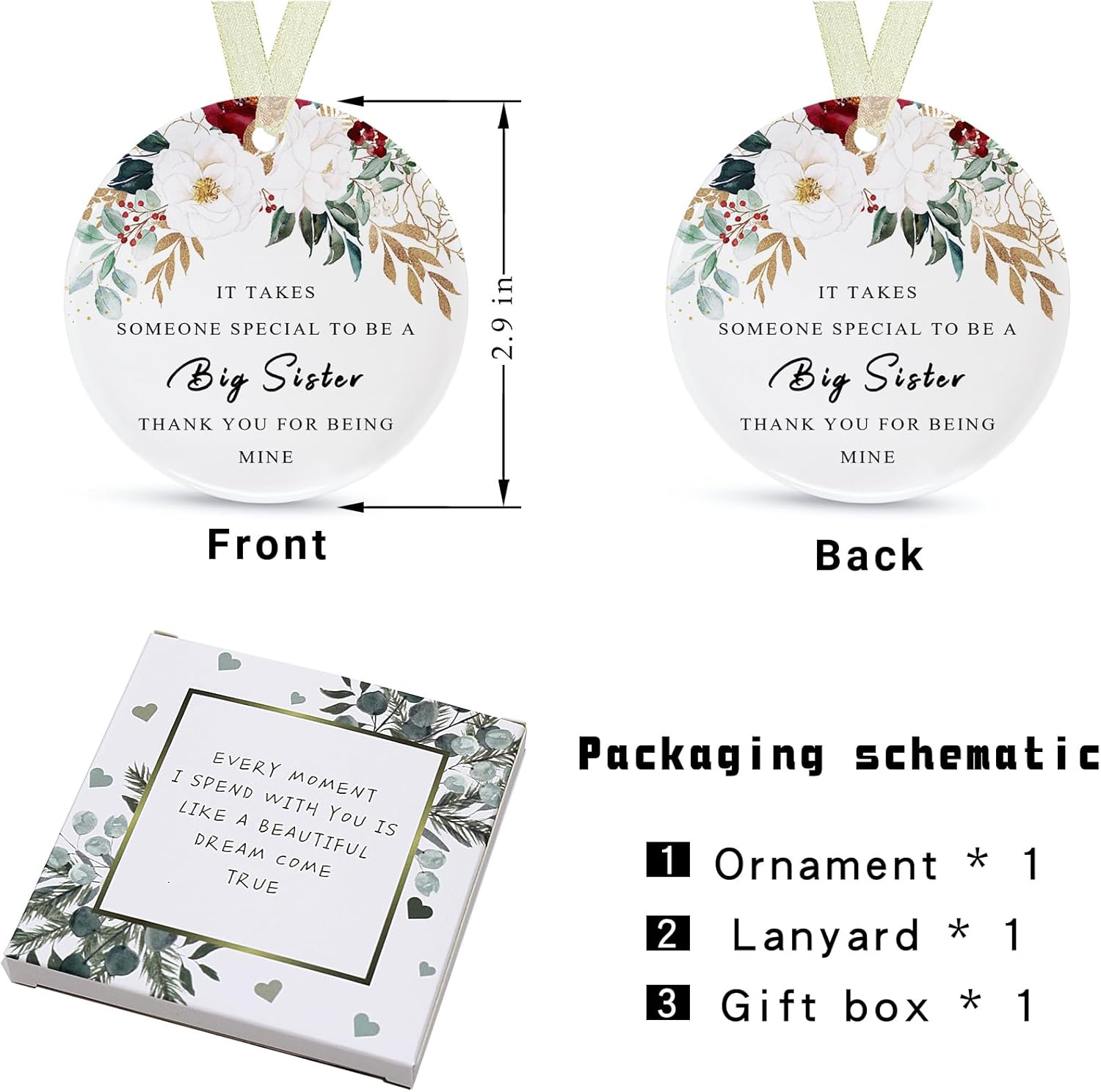 - đŒăPerfect and delicate sizeăThis is a sister memory ornament with a diameter of 2.9 inches and a thickness of only 0.18 inches. The product includes: a round sis ornamentt*1, a gift box*1 and a lanyard*1. The gift box comes with it makes it easy for you to give the best sis ever gifts directly to family and friends and other special people in your life, and the lanyard that comes with it helps to hang it easily on the Christmas tree or anywhere you want.