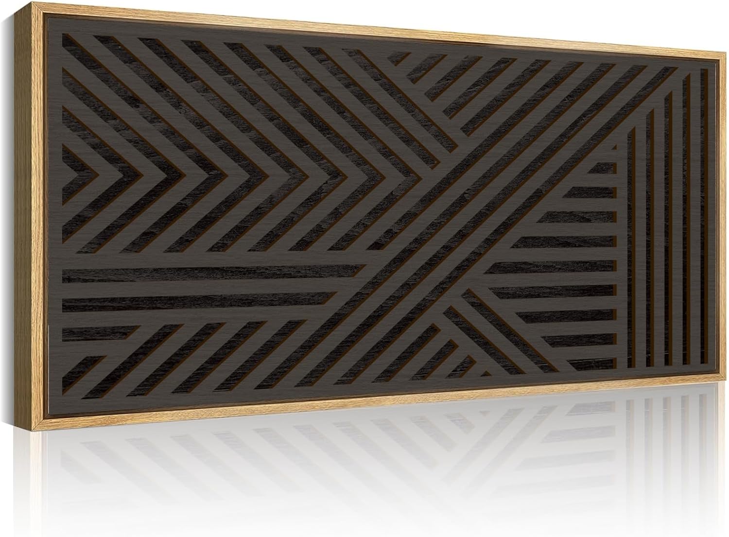 - 【Large Black Wood Wall Art 】20*40 inches(about 50*100cm).This black minimalist double-layer 3D panel is made up of MDF on the bottom and a carved hollow section of poplar board on the top. The design adopts carving technology, with the appearance of log color and geometric graphic elements, which conforms to the artistic aesthetic concept of modern home decoration and is elegant and beautiful in any scene hanging at home.Besides, this double-layer panel is also wrapped with a 1 inch frame to increase the sturdiness of the wood decor.