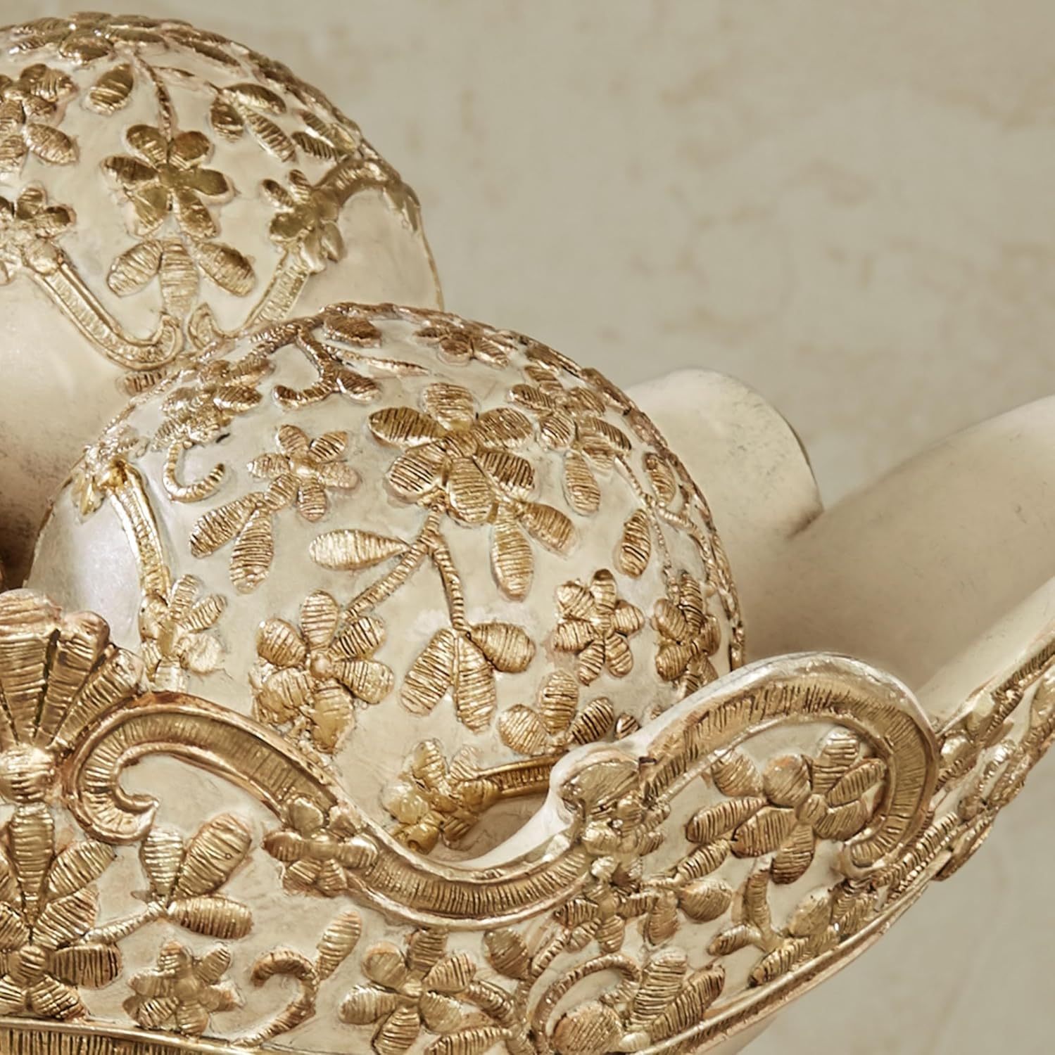 - DESIGN ELEMENTS: Centerpiece bowl with raised gold florals and scrolls. Handpainted accents have an ivory and silver background. Perfect as a centerpiece bowl orbs set for any elegant decor.