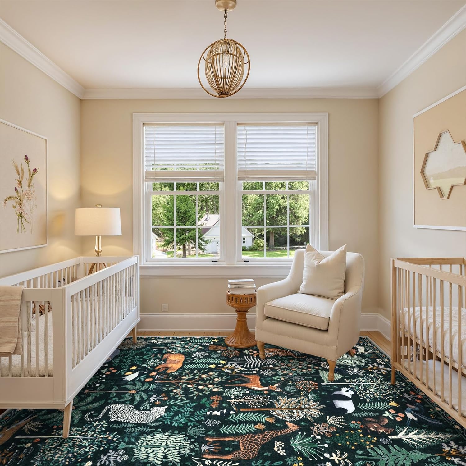 - Unique & Functional: This dining room rug features a delightful assortment of animals - tigers, pandas, giraffes, elephants, and more - surrounded by tropical flora. The best choice for your living room, kitchen, entryway, bedroom, home office, dining room, kids' playroom, nursery, dorm, kids' room or more