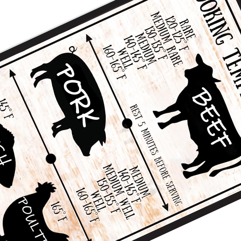 - Vintage Metal Tin Signs Usage Scenarios: Funny Meat Temperatures Cooking Chart Decor Suitable For You To Hang Directly On The Wall Or Door Of Your Room, For Kitchen, Dining Room, Living Room, Bedroom, Bathroom, Office, Bar, Cafe, Club, Dorm, Man Cave, Garage, Garden, Street, Hallways, Road, Garag Wall Art Decoration. To Add More Charm To Your Life.