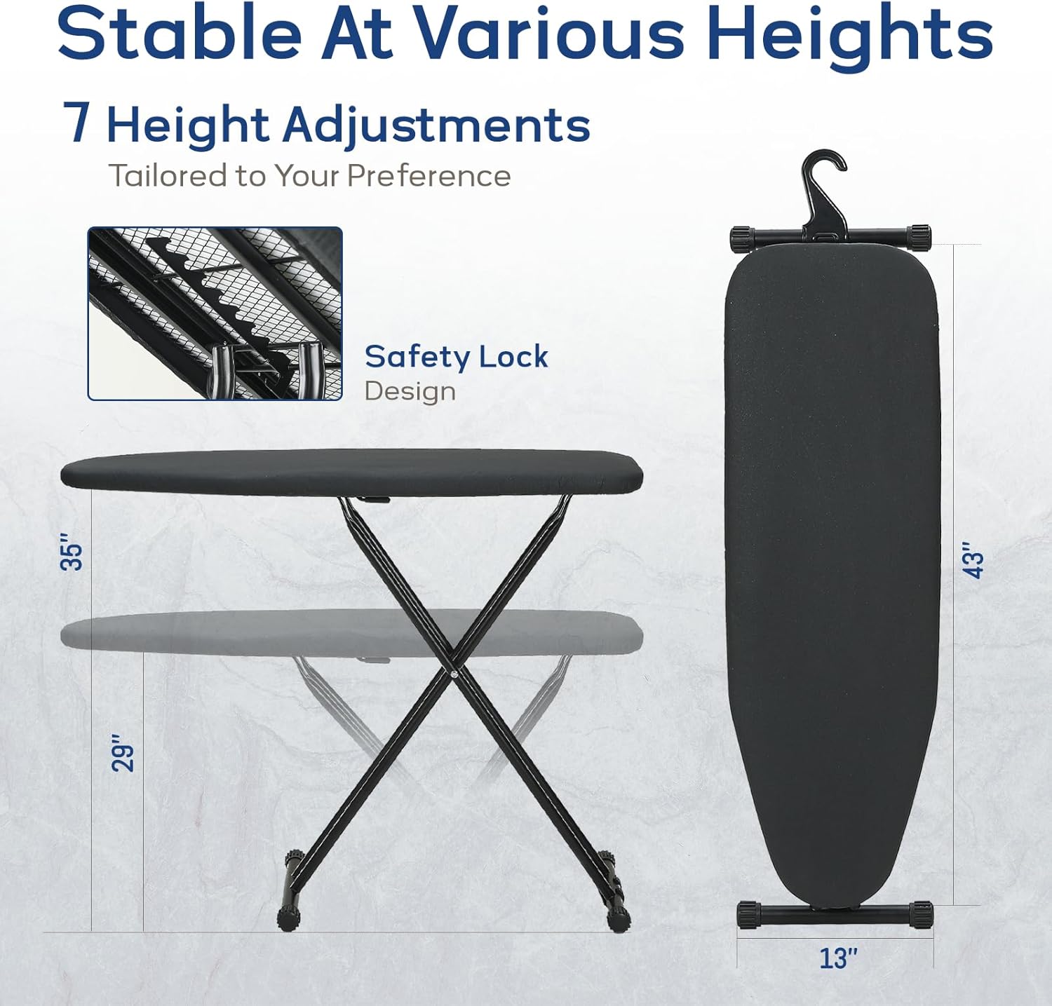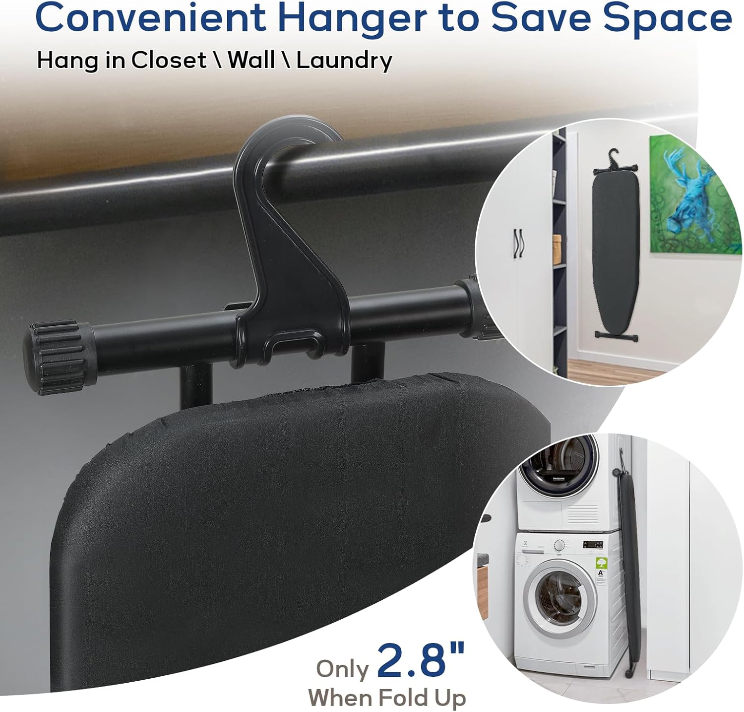 Ironing Board 43x13 with Iron Rest, RAINHOL Compact Iron Board Full Size with Thick Cover and Pad, Easy Storage Hanger with Heat-Resistant Silicone Pad, Space Saving and Height Adjustable, Black