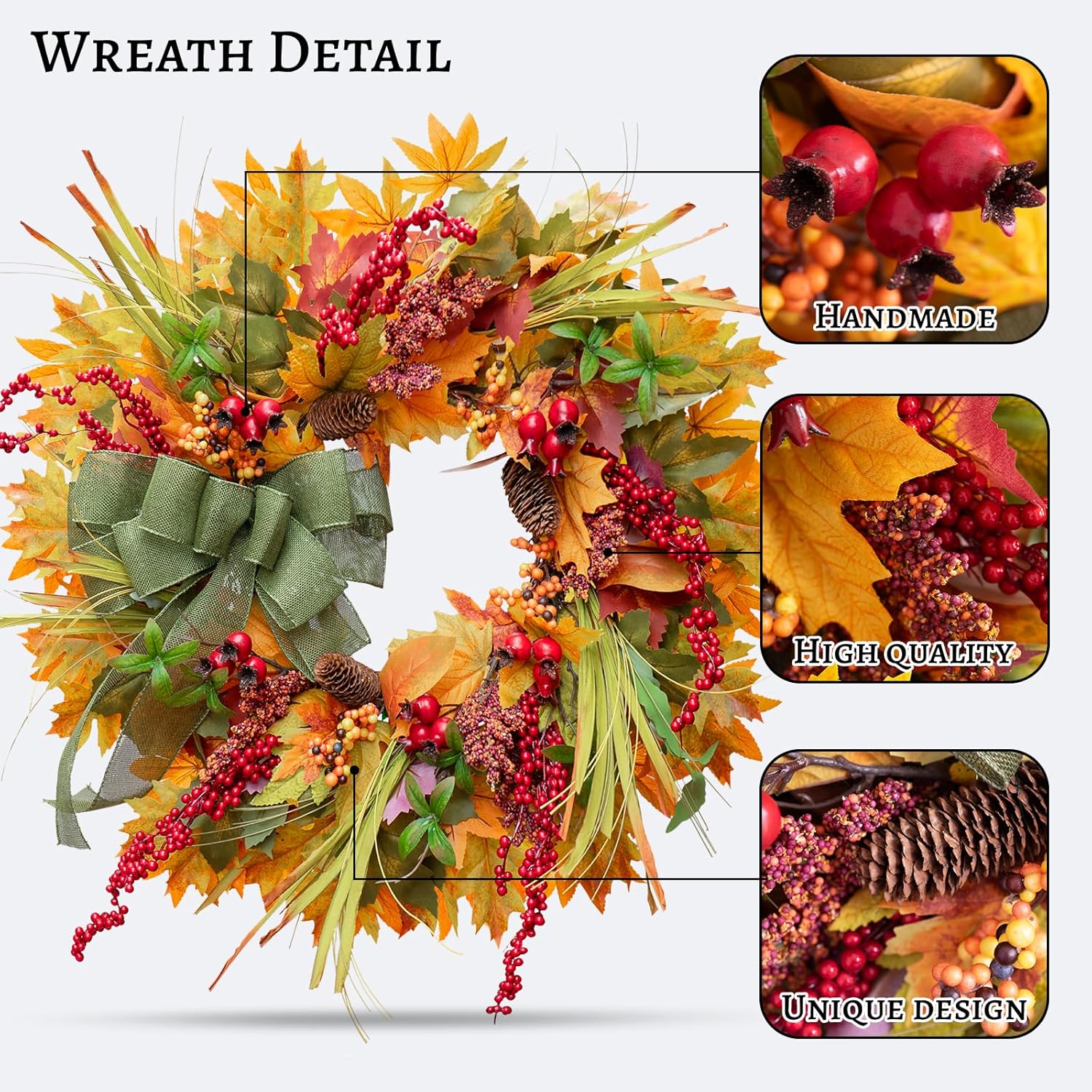 - Special Feature : Green Bow, Natural Grapevine, Natural Pine Cones, Orange Maple Leaves, Red Realistic Berries