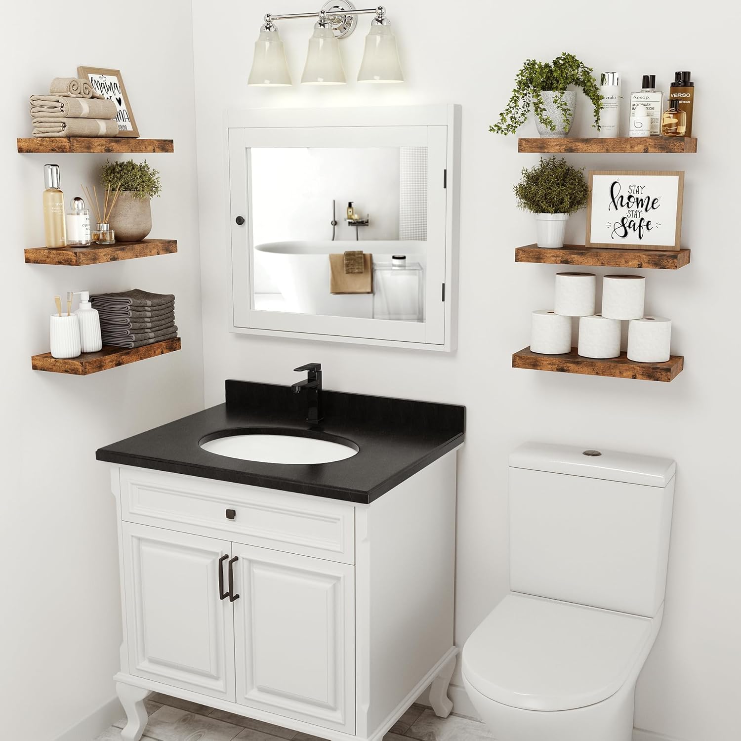 - Engineered Wood & Wall Mounted Design - Slight color differences may occur due to lighting and screen settings.Our MDF bathroom floating shelves for wall are made of wood which grows naturally, so each piece of the board has unique natural wood grain and color. Through the simplest charcoal roasting process, we restore the carbonized color and texture of the wood itself. It highly recommend them for anyone looking to add functional and stylish storage to their bathroom space.