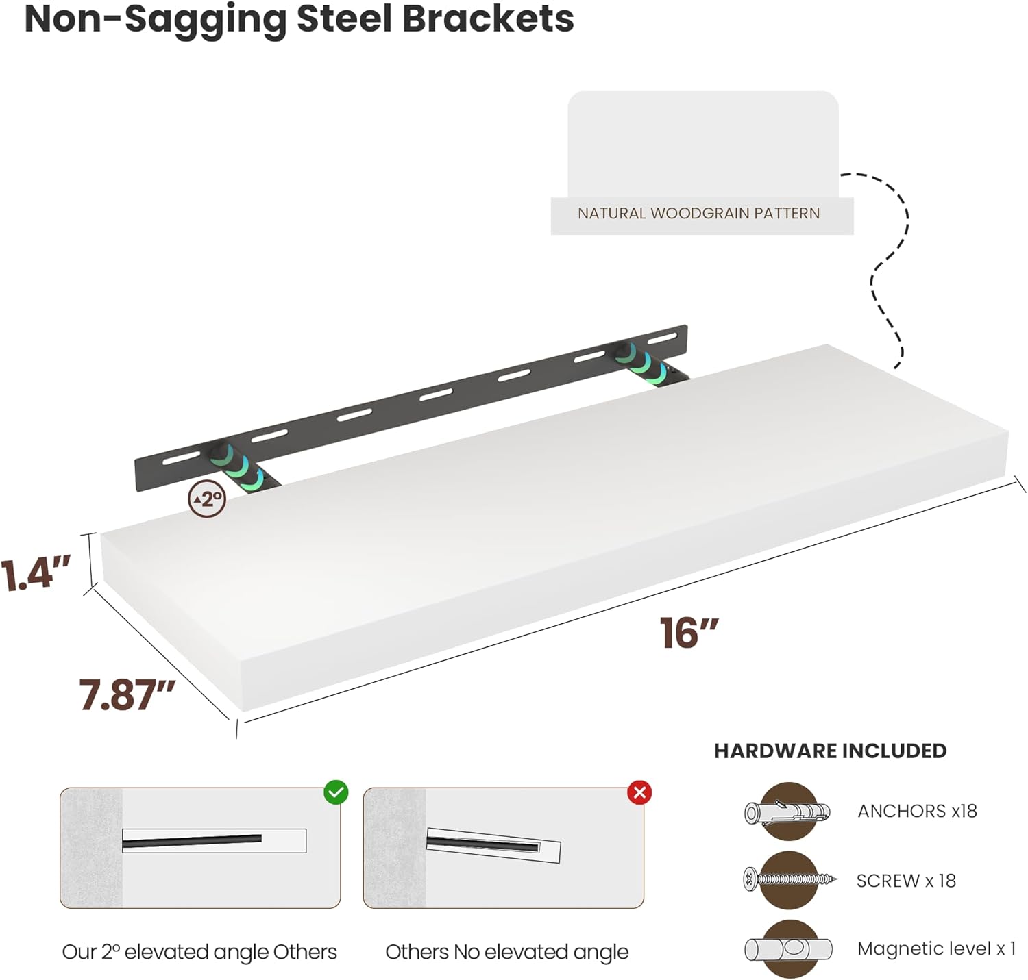 Floating Wood Shelves for Wall 16 Inches x 8”x 1.4” Shelf Floating Home Decor, Heavy Duty Shelf Hold 35 lbs, Wall Shelves for Bathroom Living Room Kitchen Bedroom Office - Set of 2 White
