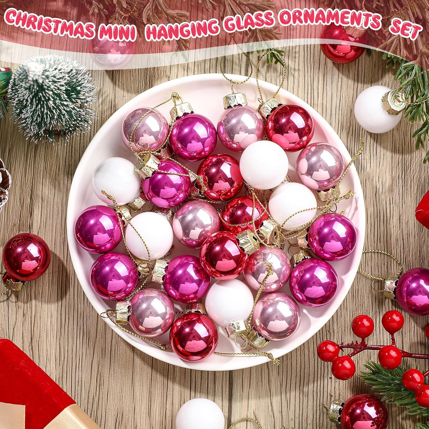 Tioncy 32 Pcs 1 Inch Mini Glass Christmas Ornaments Balls Shiny Christmas Balls Tiny Tree Hanging Decoration Small Colorful Ball Pendant for Xmas Party Supplies(Pink Series, White)