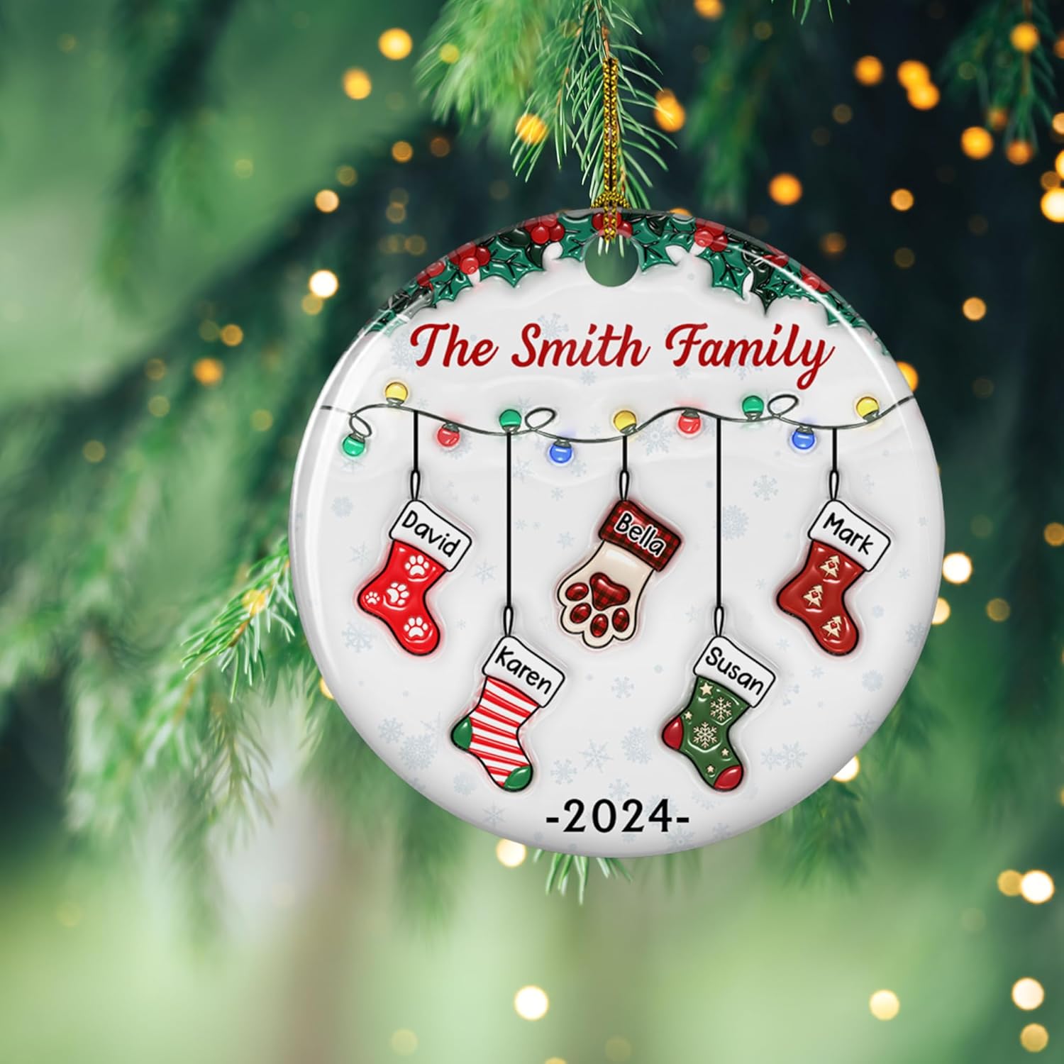 - 🎄 Personalized Stocking Design – Celebrate your family's togetherness with this customizable ceramic ornament. Add up to 10 names, representing each family member with their own festive stocking, making it the perfect way to commemorate Christmas 2024.