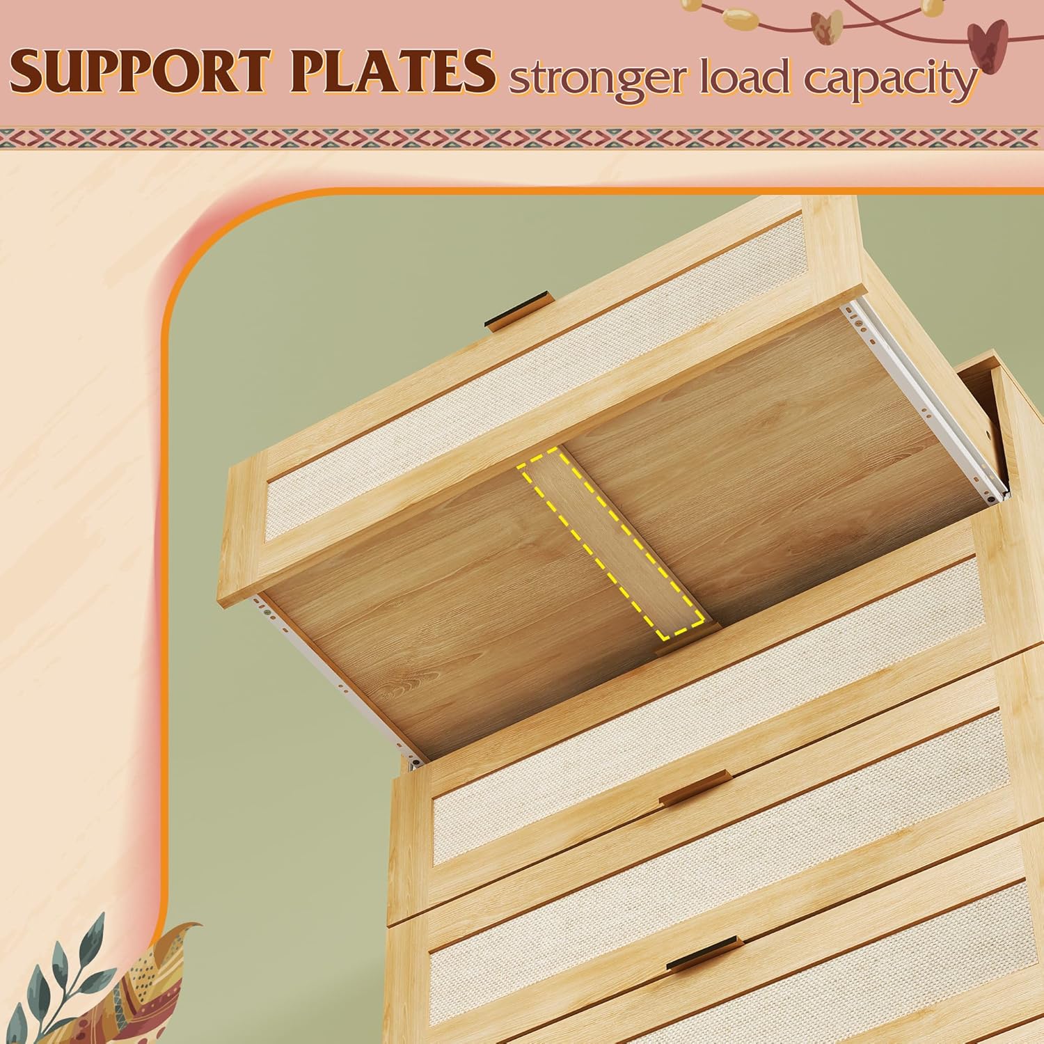 - đăBoho 5 Drawers DresserăThis wooden dresser is made of light wood with wood texture and warm color. The surface of each drawer is decorated with a rattan texture, and the metal handle is smooth and durable. The boho dresser can be used for bedroom clothing organizer, entryway table, decorative storage for living room.