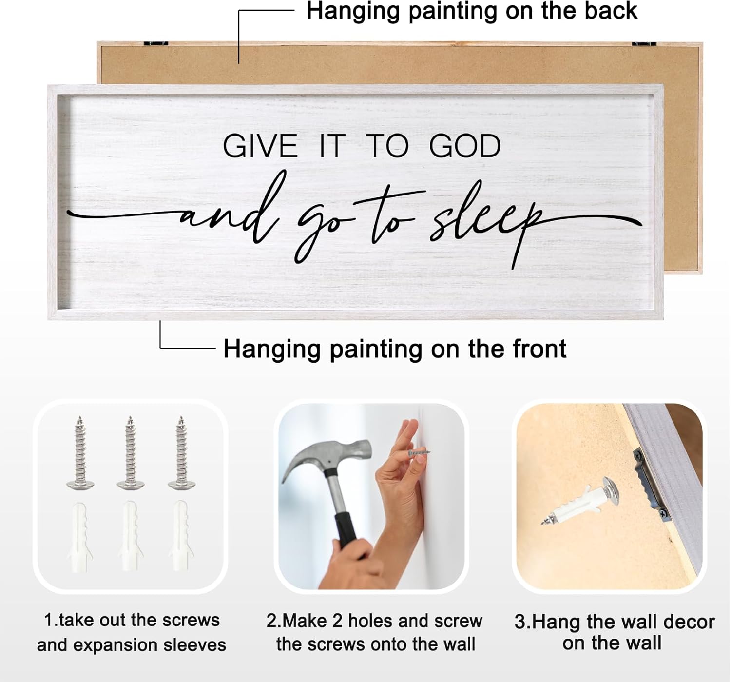 - 【Easy Installation】The inspirational give it to god and go to sleep sign white wall art is equipped with plastic expansion and self-tapping screws, which will take you less than ten minutes to install it on the wall.