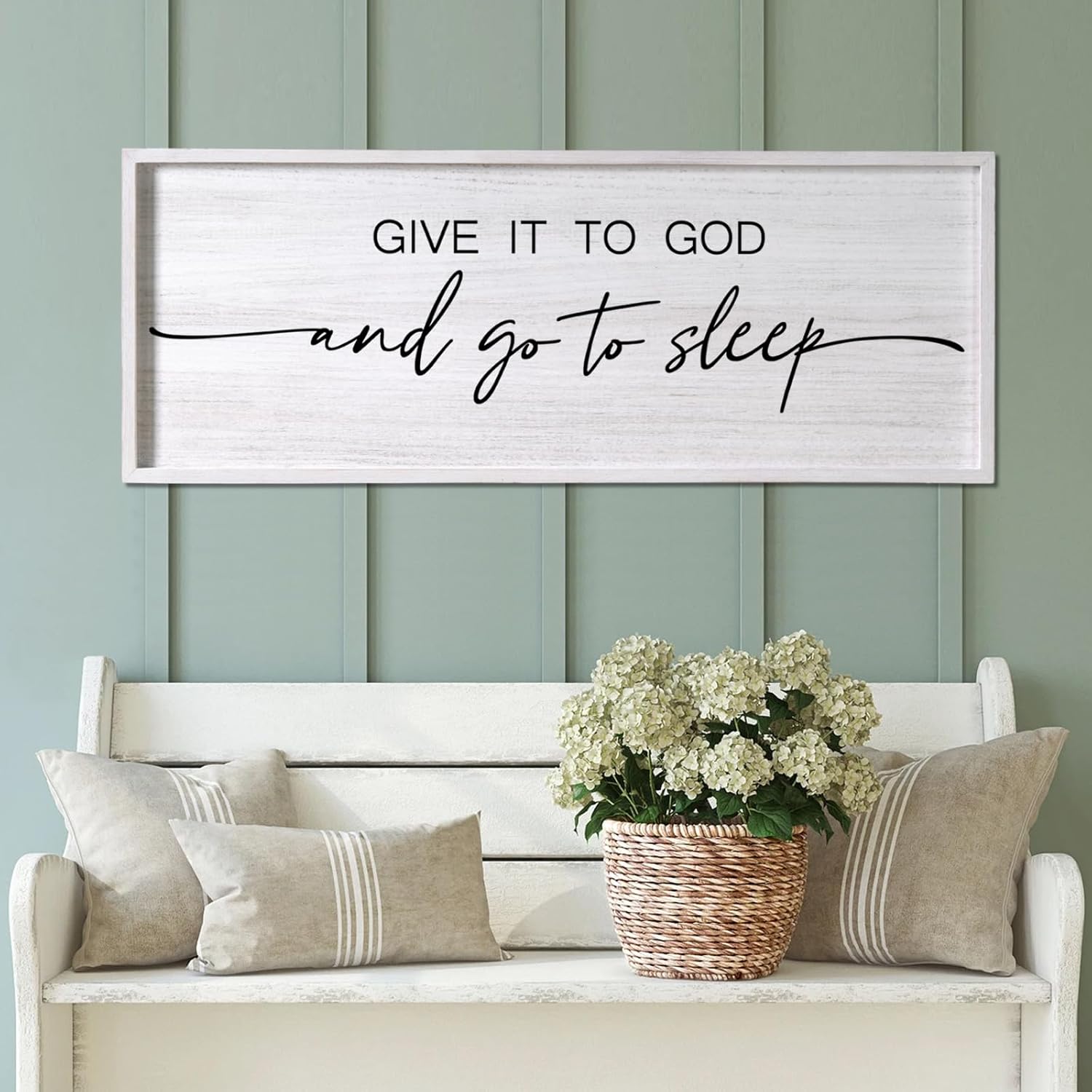 - 【High-quality Solid Wood】The aesthetic motivational give it to god and go to sleep saying wall decor above bed is handcrafted of high-quality solid wood with a distressed finish, white text design, and white solid wood frame, which is simple and durable, not easy to fade and deform, and can accompany you and your lover for a long time, witnessing the sweetness of love.