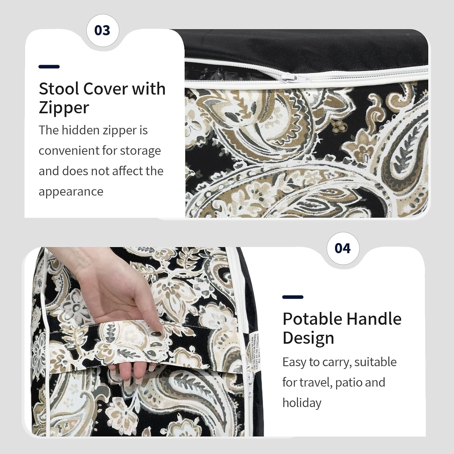 Inflatable Ottoman Stool D31 xH14 for Outdoor/Indoor Use, Water Repellent Patio Foot Rest Stool with Portable Handle,Round Pouf Ottoman Suitable for Garden,Deck and Camping - Paisley Black