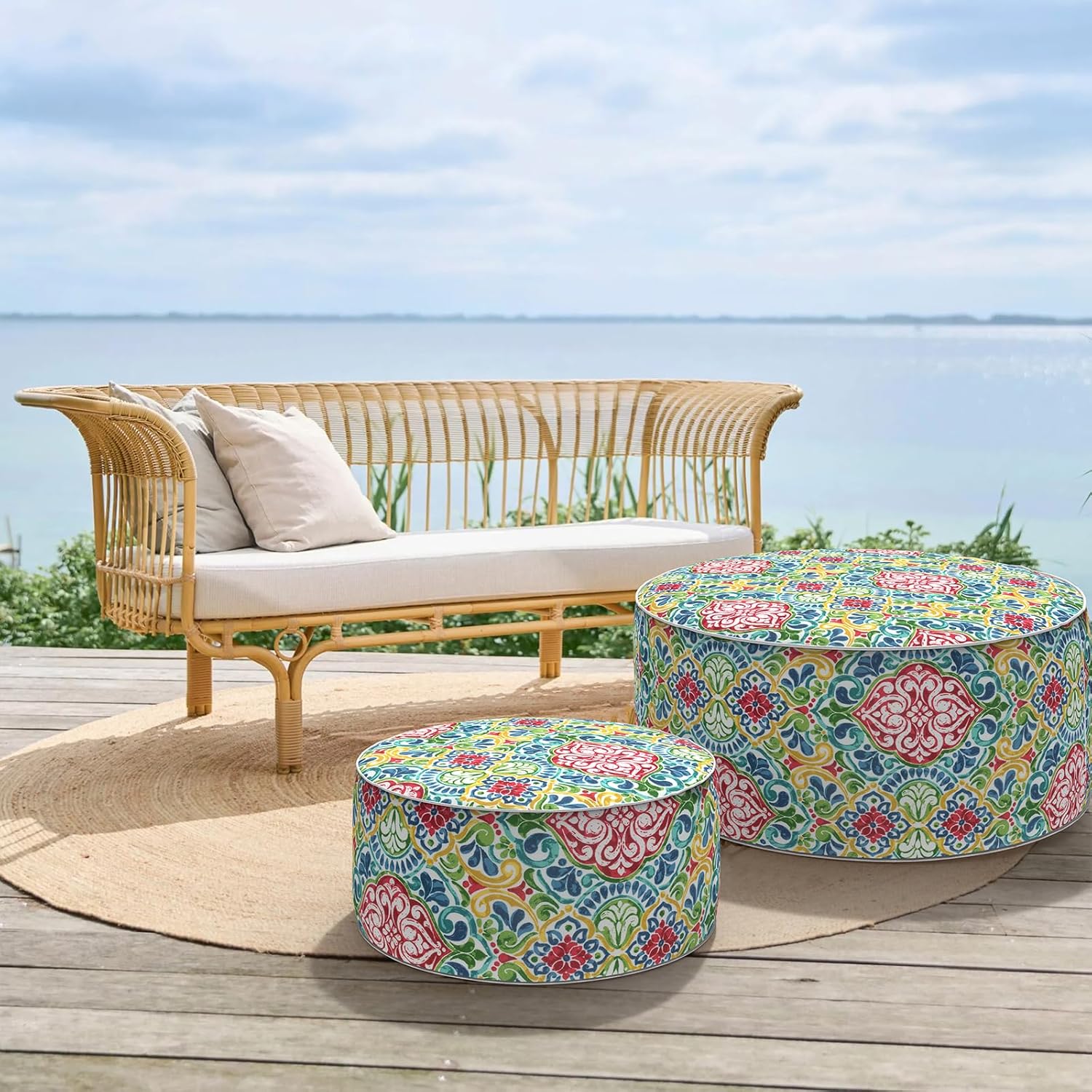 Inflatable Ottoman Stool D31 xH14 for Outdoor/Indoor Use, Water Repellent Patio Foot Rest Stool with Portable Handle,Round Pouf Ottoman Suitable for Garden,Deck and Camping - Damask Red