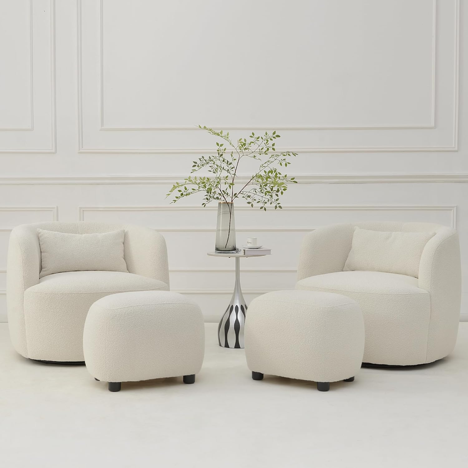 - Package Includes: 2 x boucle swivel barrel chairs (Dimensions: 32.7"D x 34"W x 29"H, no assembly, one toss pillow); 2 x boucle upholstered ottomans (Dimensions: 18.5"D x 23"W x 16.5"H, simply screw legs into pre-threaded holes). Two throw pillows includes in this living room boucle chair ottoman furniture set.