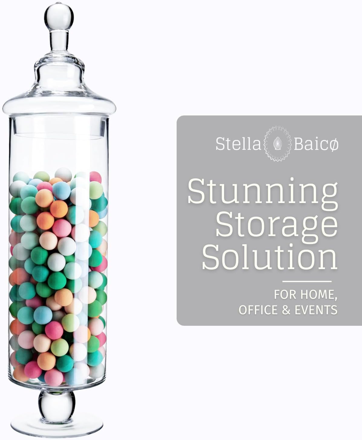 - MULTIPLE USE: Not only for your Home, this large candy jar for candy buffet is very sturdy and fancy, perfect for adding decoration to weddings or parties. The tall candy jars glass bring a touch of luxury and modern design to any event. Stella Baicø glass candy canister can also be a perfect gift for family and friends.