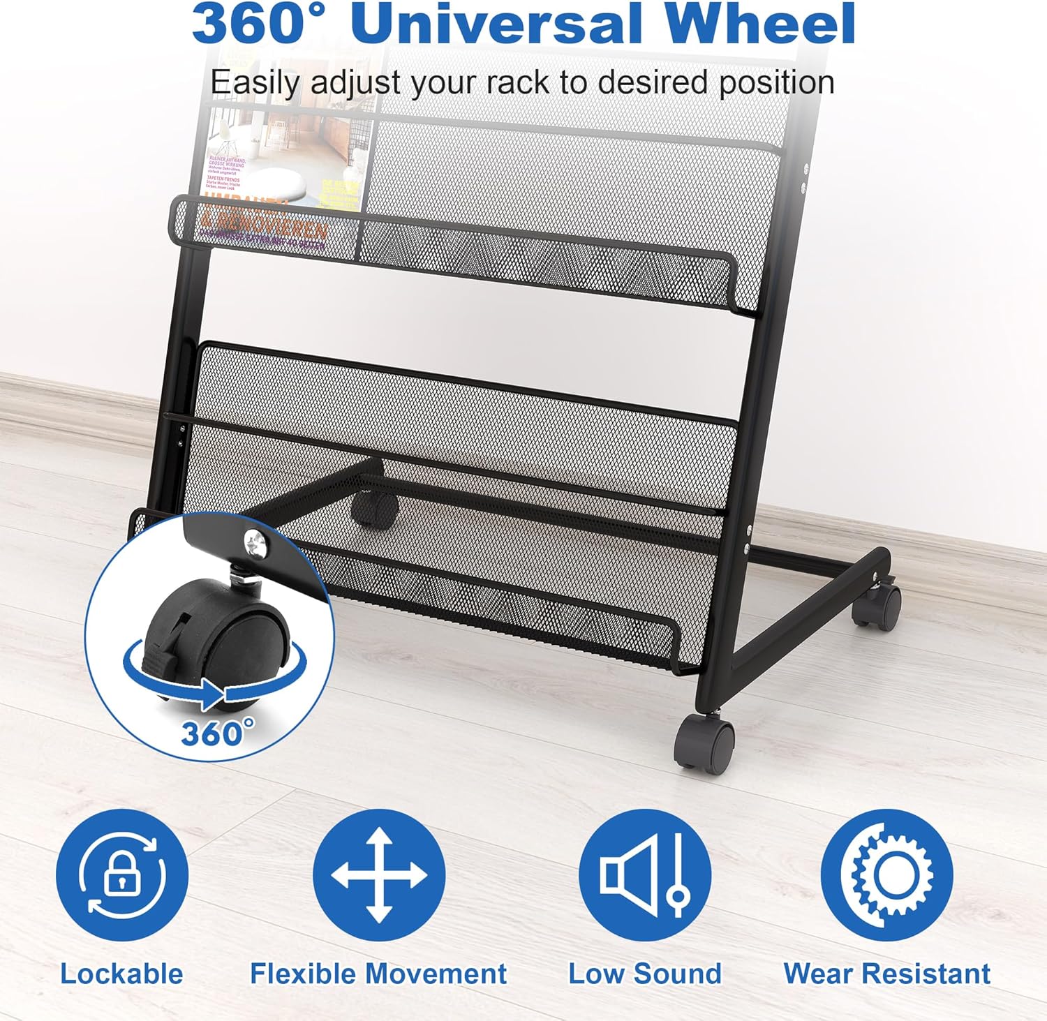- đăEASY TO INSTALLăThis magazine holder floor with wheels package contains installation tools and easy to understand instructions, assembling this magazine rack will take you little time. We provide after-sales service, if you have any questions about the product, you can contact us in time, we will help you solve it within 24 hours!