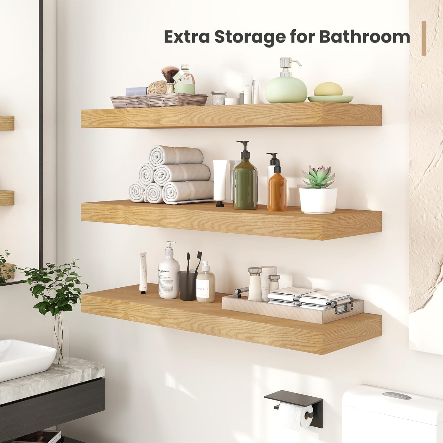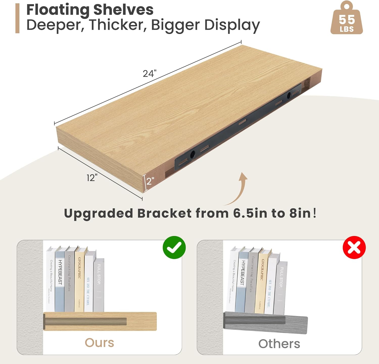 Heimlove 24 x 12 Inch Deep Floating Shelves Wall Mounted with Invisible Brackets,Storage Hanging Shelf for Wall Decor in Bathroom, Bedroom, Toilet, Kitchen, Living Room, Office Set of 2 (Oak)