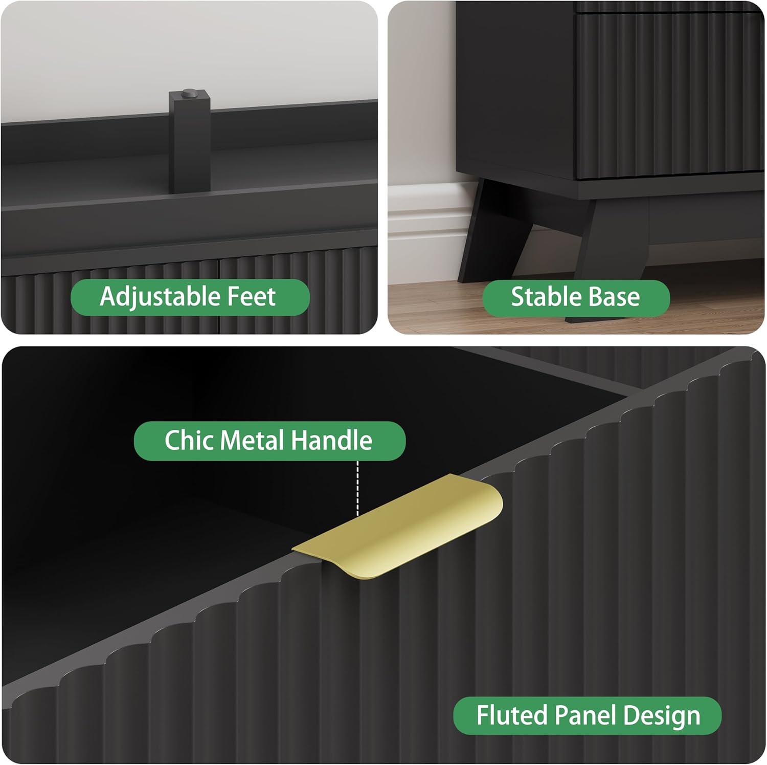 - ăModern Chic AppearanceăThe unique wave-like fluted panel enhances the texture and elegance of this bedroom dresser. The thick table top features natural wood grain that complements the black finish. The wide metal handle and splayed base legs add a modern touch, creating a personalized and distinctive appearance