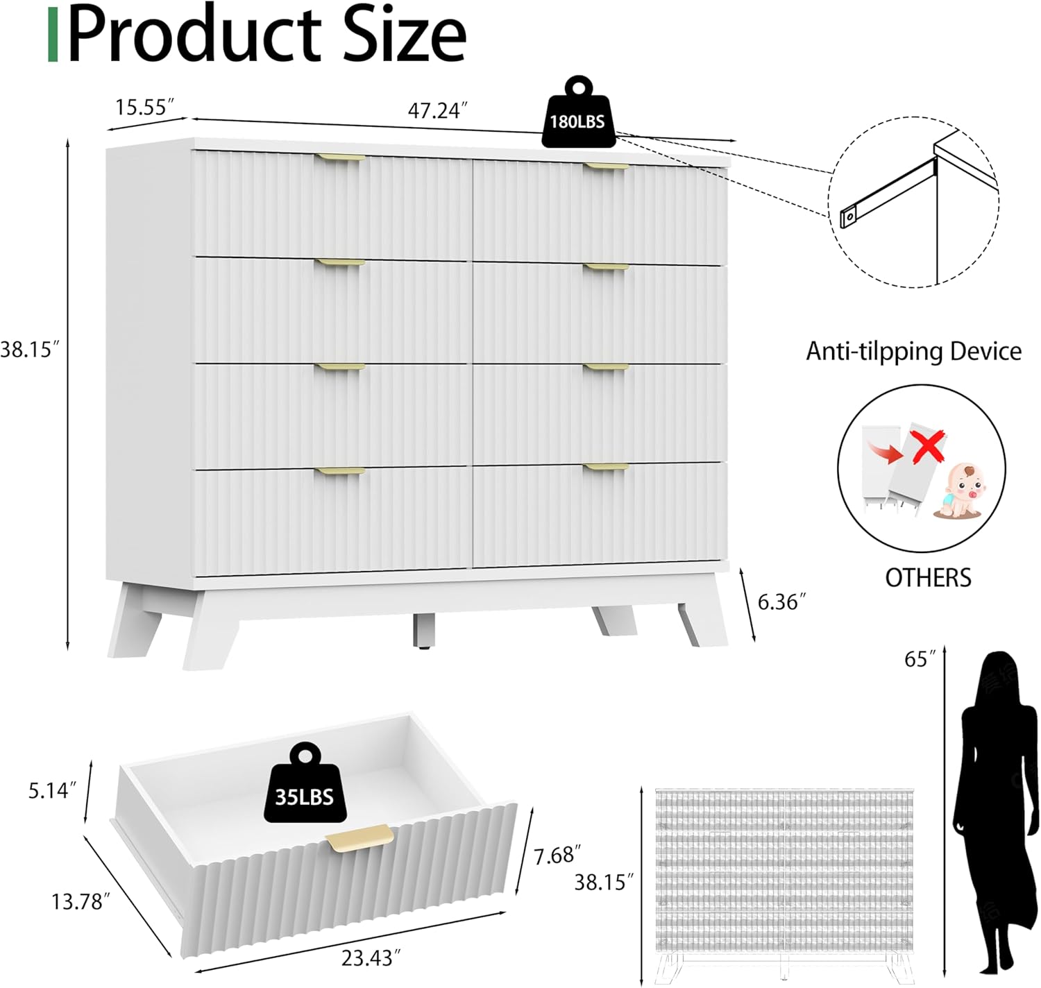 - ăLarge Storage CapacityăThe dresser for closet features 8 deep drawers that provide plenty of room for organizing clothing, bedding, cosmetics, or jewelry, helping you maintain a neat and tidy space. The wide wooden tabletop can serve as a dresser TV stand or display your decorations such as photo frames, plants or mirrors. Perfect for bedroom, living room, hallway, entryway