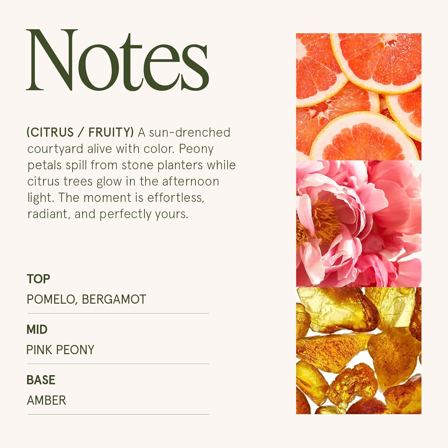 - CITRINE & PINK PEONY: A vibrant fragrance that opens with zesty pomelo, bergamot, and grapefruit, unfolds into a delicate bouquet of pink peony, white tea, and geranium, and finishes with warm cedarwood, amber, and cardamom