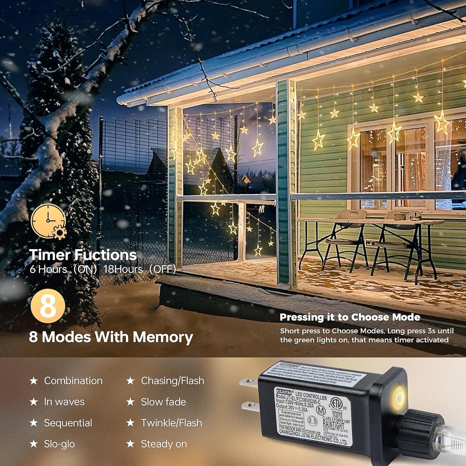 126L Warm White Star Icicle Lights, 8.2FT Clear Curtain Fairy String with Connectable, Timer 8 Modes Memory, Waterproof Hanging for Christmas,Ramadan,Party,Wedding Indoor Outdoor Decorations