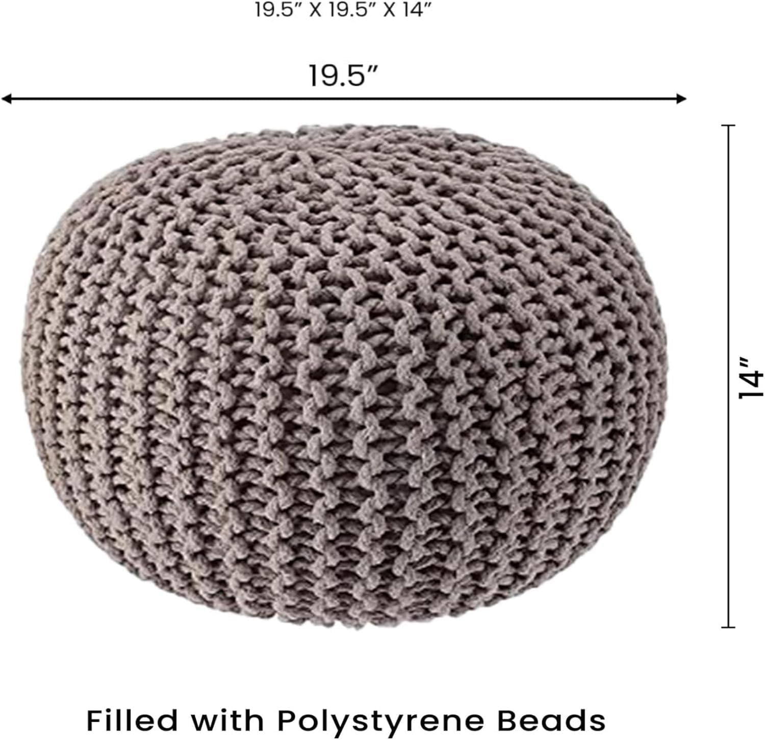 - HANDMADE FROM THE FINEST MATERIALS: The outer material on this farmhouse indoor pouf ottoman is made from 100% cotton and filled with high-density EPS beads. Each floor pouf measures 19.5"x19.5"x14" inches and is handmade by our talented artisans. Please allow a size variation of 1-2 cm as each piece is unique. As this is a round shaped accent pouf, place the tape at the widest part (center of ottoman) on both sides while measuring to get the right dimension