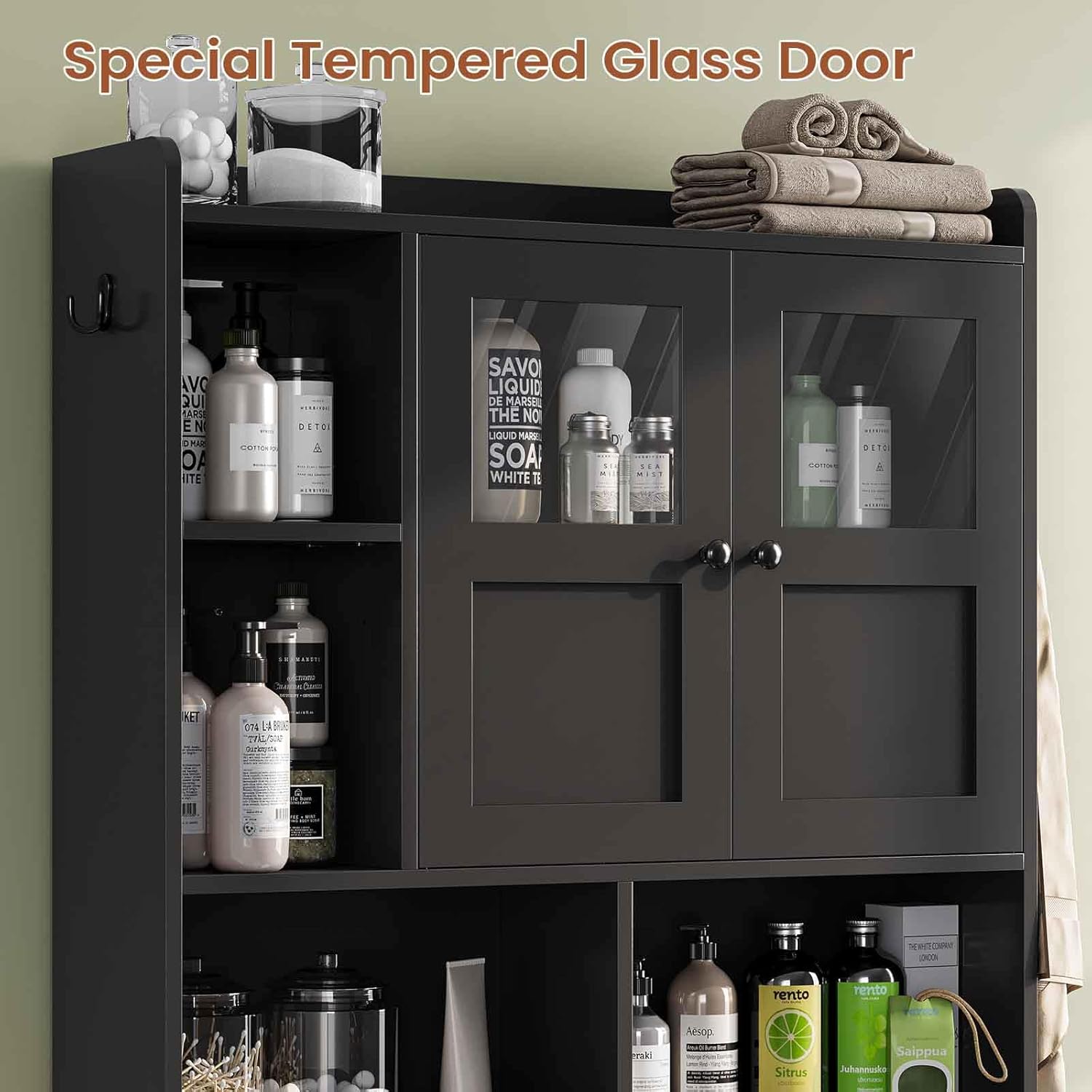 - ăModern Tempered Glass DesignăThis black bathroom storage cabinet with clear tempered glass doors allows you to easily find what you need, combining practicality with aesthetics. Designed in modern minimalist style, it has a charming look that complements your home decor.