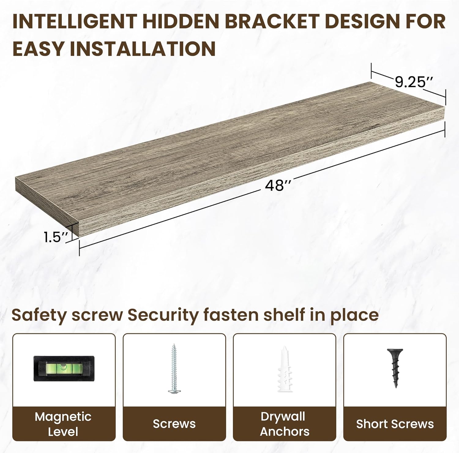 - ăEasy InstallationăDesigned with user convenience in mind, these shelves come with all necessary mounting hardware and clear instructions. You can have them up and ready to use in less than 5 minutes. Plus, our customer service is always ready to assist with any queries or concerns, ensuring a hassle-free experience
