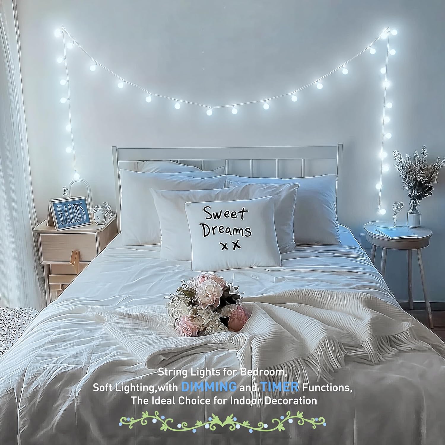 - 【Connectable Decorative String Lights】The length of white string lights is 33 ft, comes with an additional 10ft lead wire, 100 LED globe bulbs. The decorative string lights indoor are connectable, meaning you can expand your decorative range as needed. Whether for a small room or a large gathering, especially weddings, the white string lights can meet your decoration needs, producing beautiful lighting displays