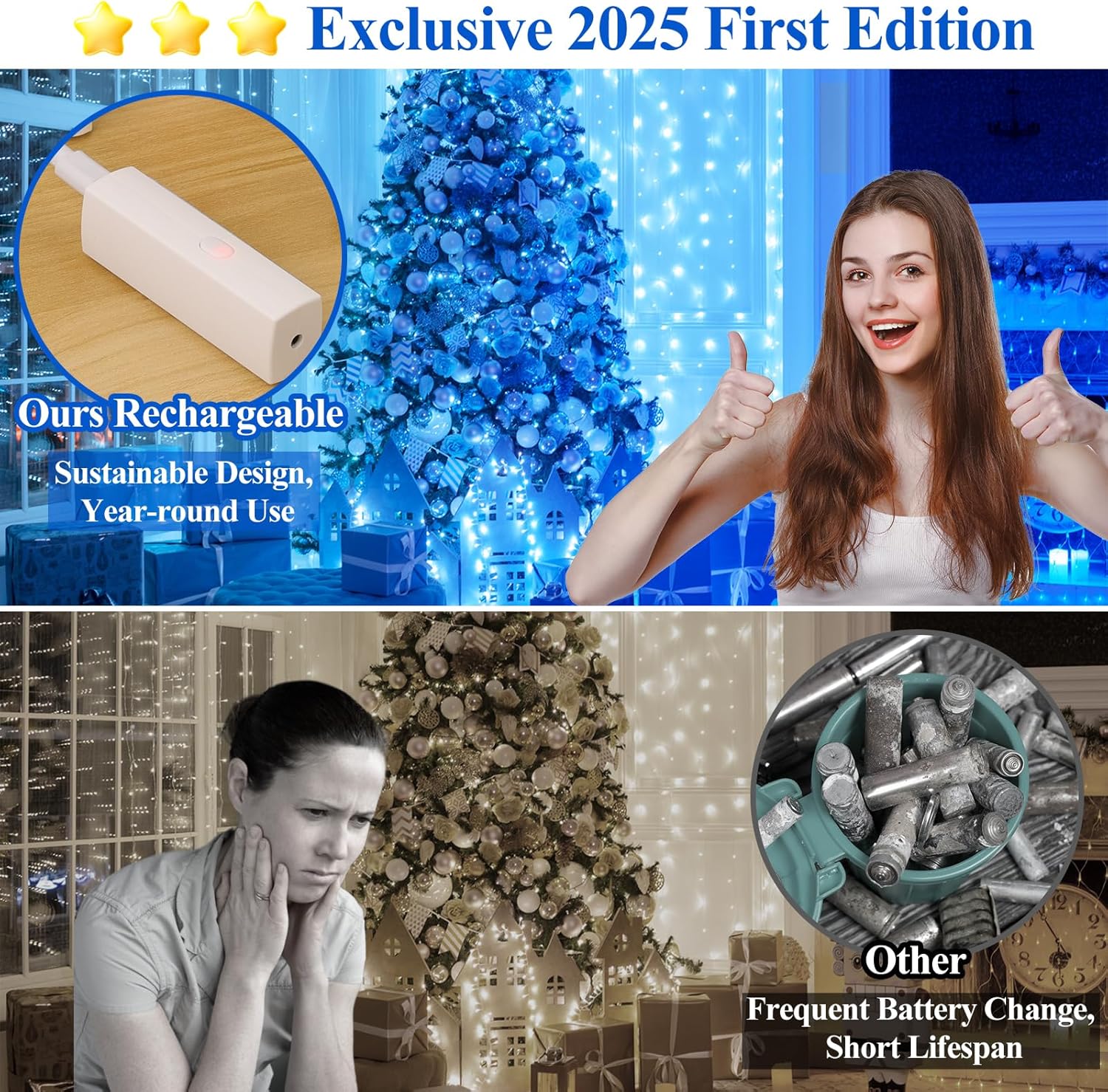 - 2025 Specially Developed Battery String Lights: Say goodbye to disposable batteries and embrace sustainability! Our rechargeable Type-C power bank (cable included) powers the twinkle lights for 30+ hours of cordless glow. When it’s time to recharge, simply detach the compact, lipstick-sized power bank—no need to move the entire fairy lights. Designed with an innovative, patented structure, this power bank offers a smarter, greener way to shine