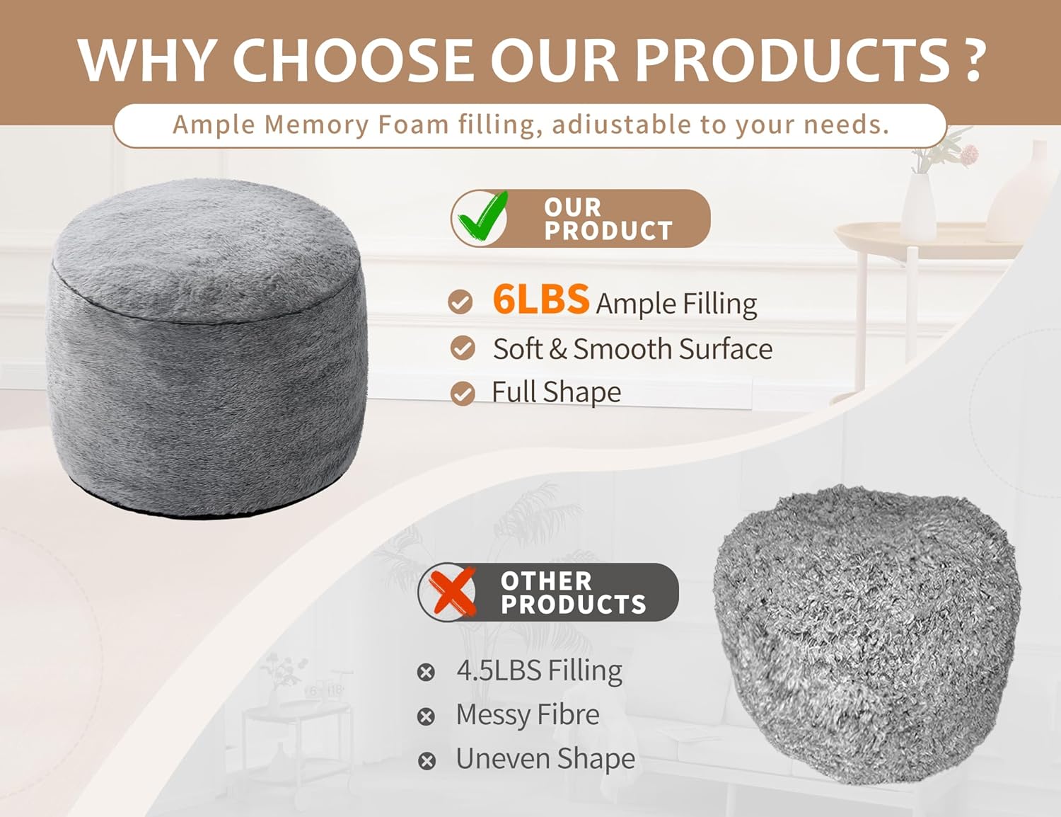 - Comfortable Ottom: The fluffy stool is made of plush fibre, with non-slip backing. The unique ottoman is entirely fabric, with no glue or cardboard, which is better for your body. The foot rest stool is more comfortable than a hard extra large pouf ottoman, and foot ottoman pouf is able to support your feet for extended periods of time. Tight and strong stitching ensures that our fuzzy ottomans will not break during daily use. The footrest pouf's thick zip is durable and easy to open and close.
