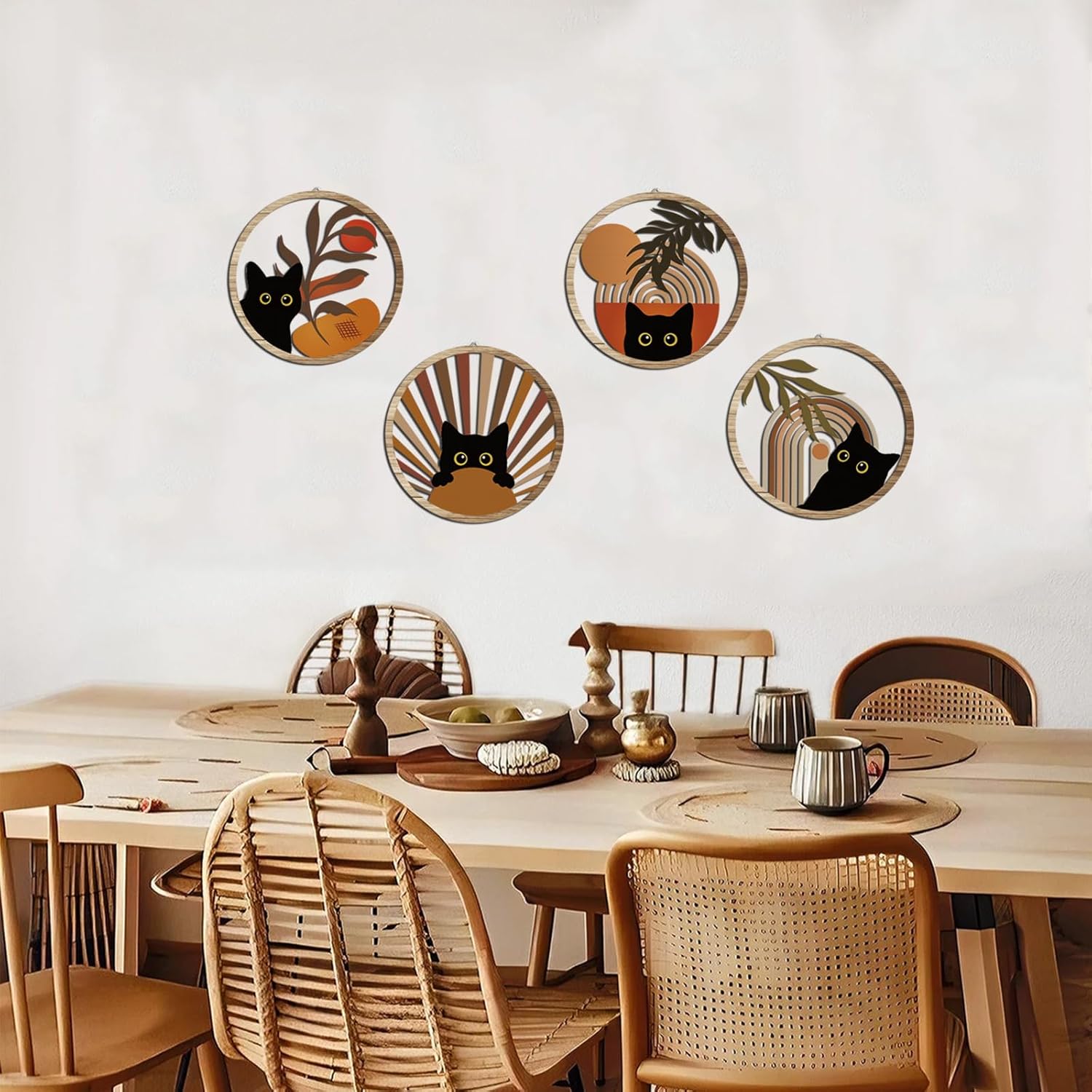 - 【Versatile Black Cat Wall Decor】: With its rustic yet modern bohemian style, this black cat wall art set is ideal for various spaces, including living rooms, bedrooms, nurseries, bathrooms, offices, patios, and even cat-themed rooms. It adds a cozy, artistic vibe to any setting.