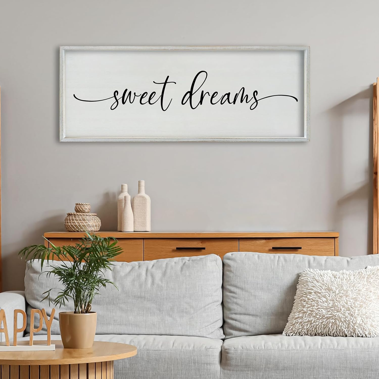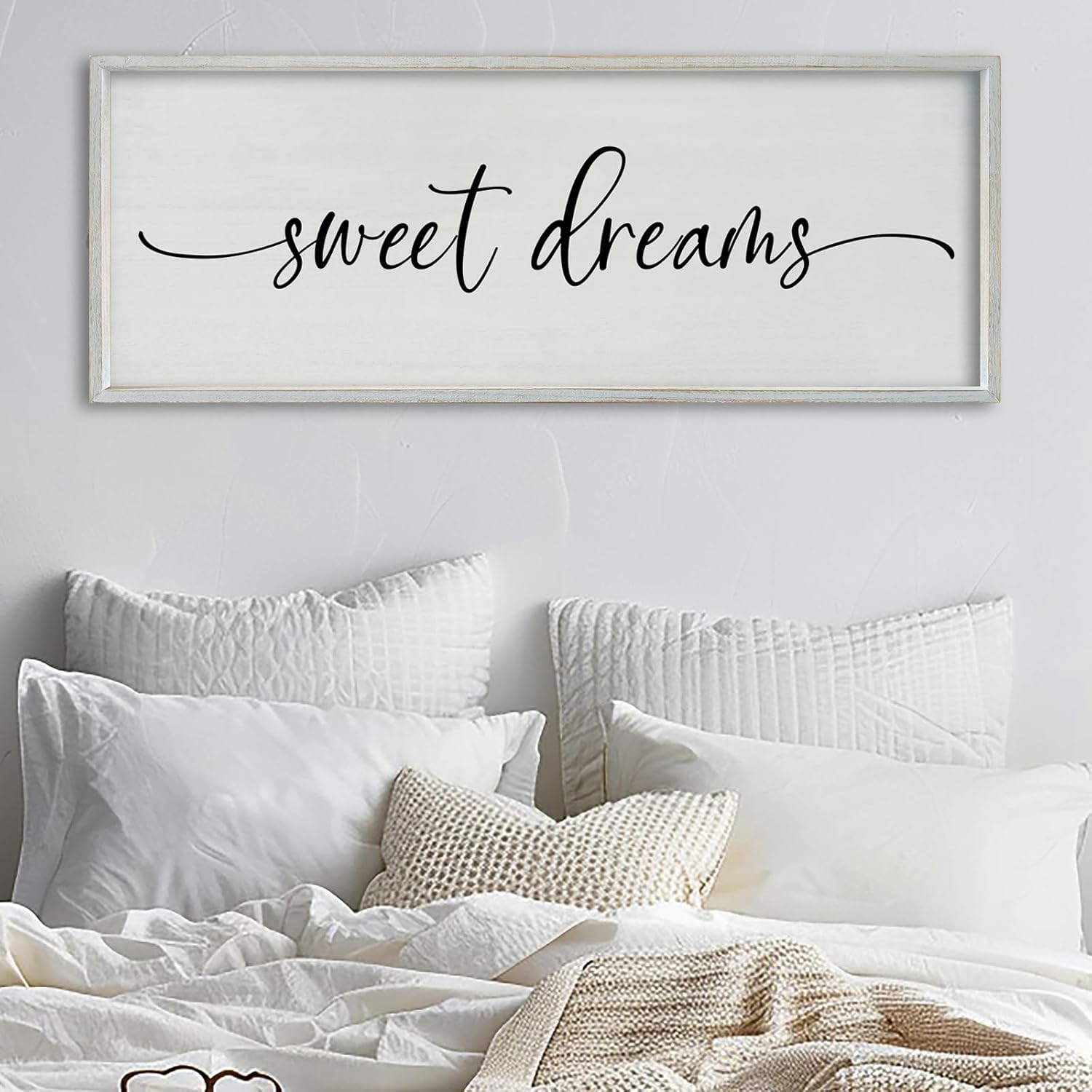SRSZHIYUE Sweet Dreams Above Bed Wall Decor, 40"x15" Large Rustic Master Bedroom Over Bed Sign Guest Room Couples Wood Framed Farmhouse Horizontal Hanging Decoration (White)
