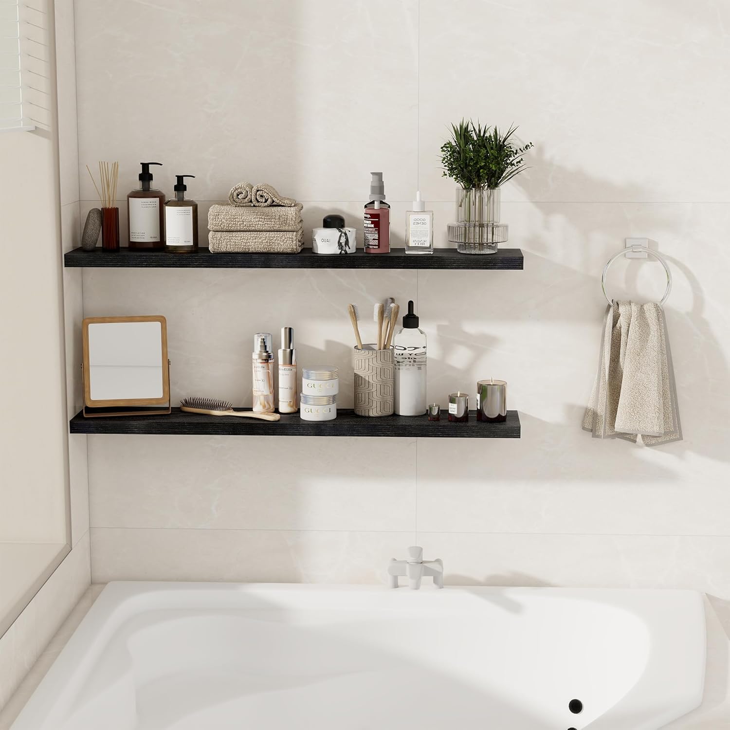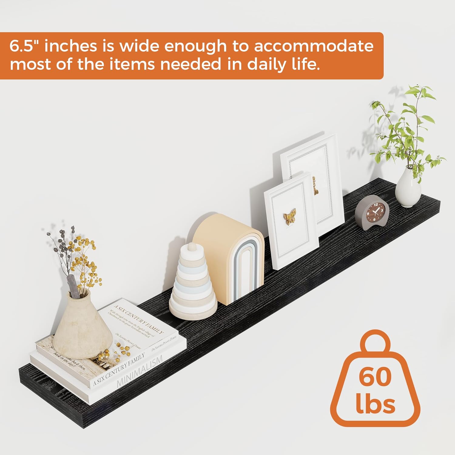 - STYLE & VERSATILITY: Elevate your home with our set of 2 elegant wall shelves, designed for versatile display options. Arrange them side by side for a clean, unified look, or stagger them for a bold, dynamic effect. Adding a touch of sophistication while providing practical storage