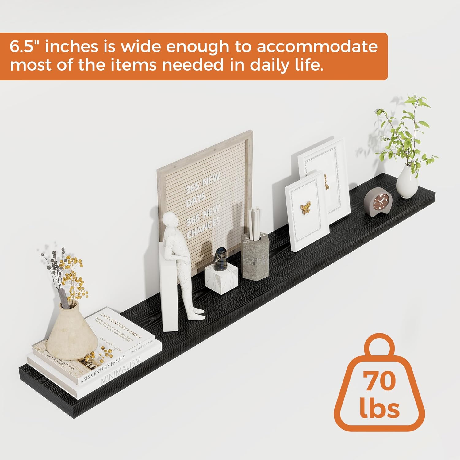 - 48-Inch Floating Shelves for Wall (Set of 2): Each shelf measures 6.5 inches in depth and 1.1 inches in thickness. This 2-piece set offers a more cost-effective and practical storage solution. Fun Memories wall shelves can be installed in a variety of ways—staggered vertically, side-by-side, or independently—to add extra storage and reduce clutter in your kitchen, bathroom, bedroom, and more. Available in multiple colors to suit different decor styles