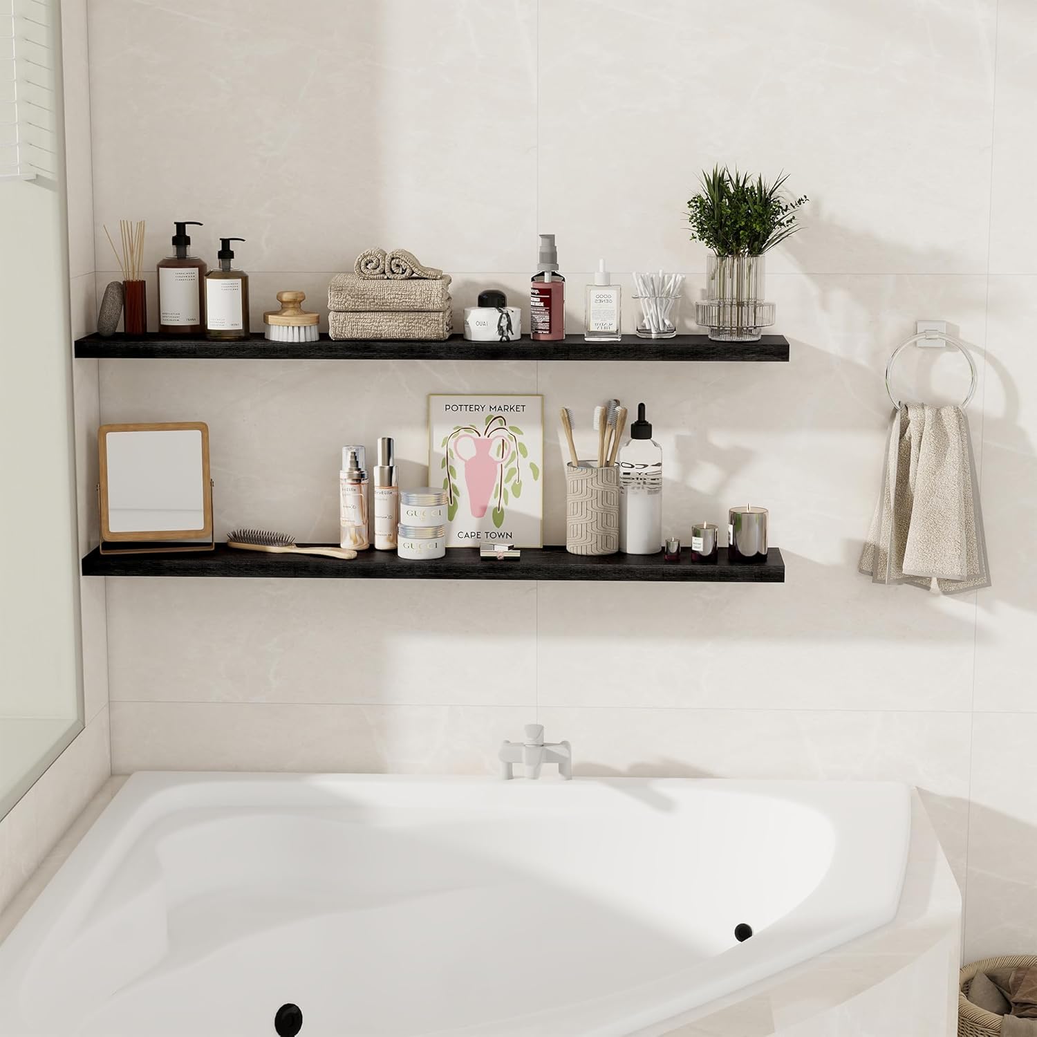 - Multi-Scene & Functional: These versatile shelves are great for any room. Use them in the bathroom for beauty products or aromatherapy, in the bedroom for books and personal items, or in the kitchen for spices and jars. They also make a stylish display shelf in the living room for photos, trophies, or collectibles. Perfect as floating bookshelves, over-the-toilet storage, kitchen shelves, or wall displays throughout your home