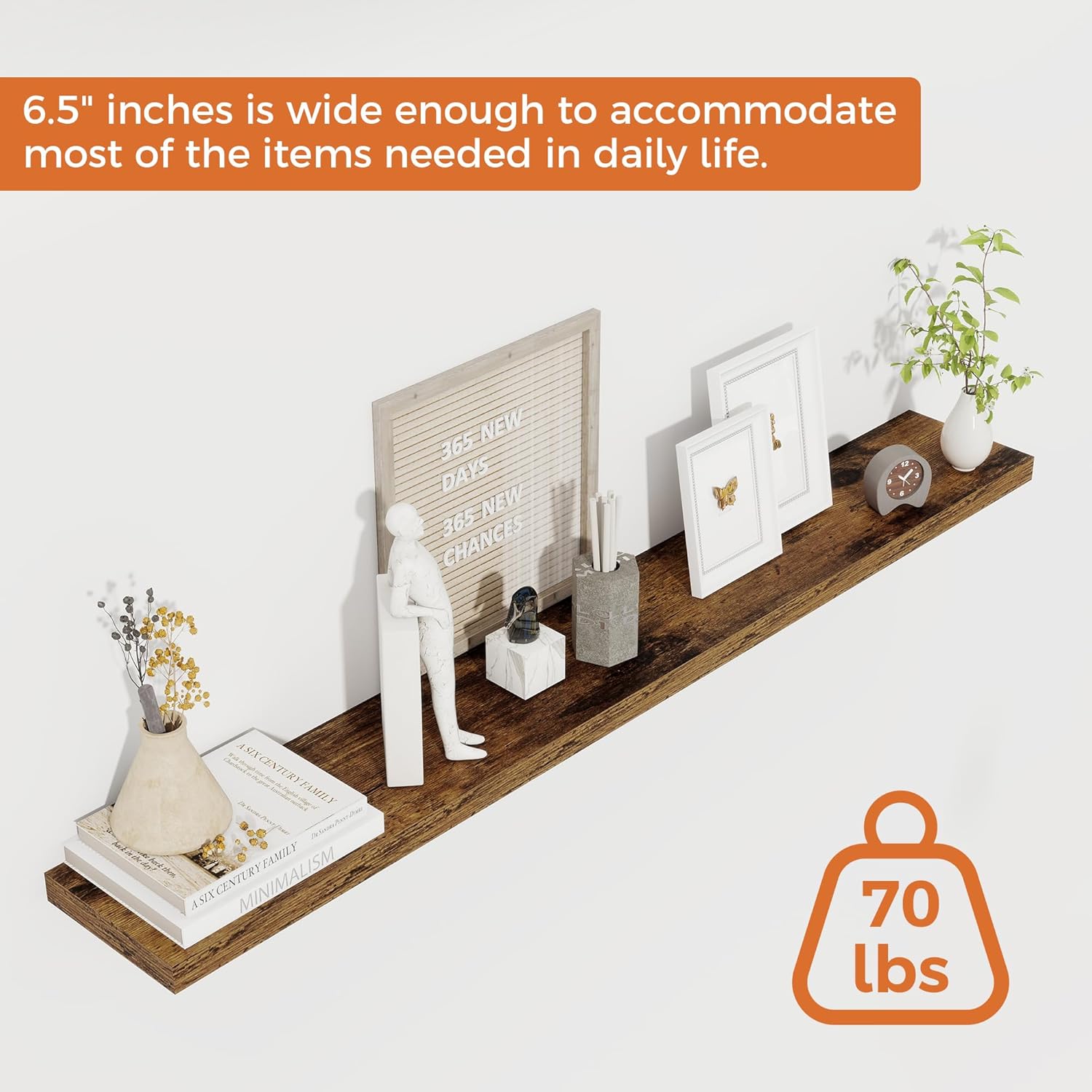 - 48-Inch Floating Shelves for Wall (Set of 2): Each shelf measures 6.5 inches in depth and 1.1 inches in thickness. This 2-piece set offers a more cost-effective and practical storage solution. Fun Memories wall shelves can be installed in a variety of ways—staggered vertically, side-by-side, or independently—to add extra storage and reduce clutter in your kitchen, bathroom, bedroom, and more. Available in multiple colors to suit different decor styles