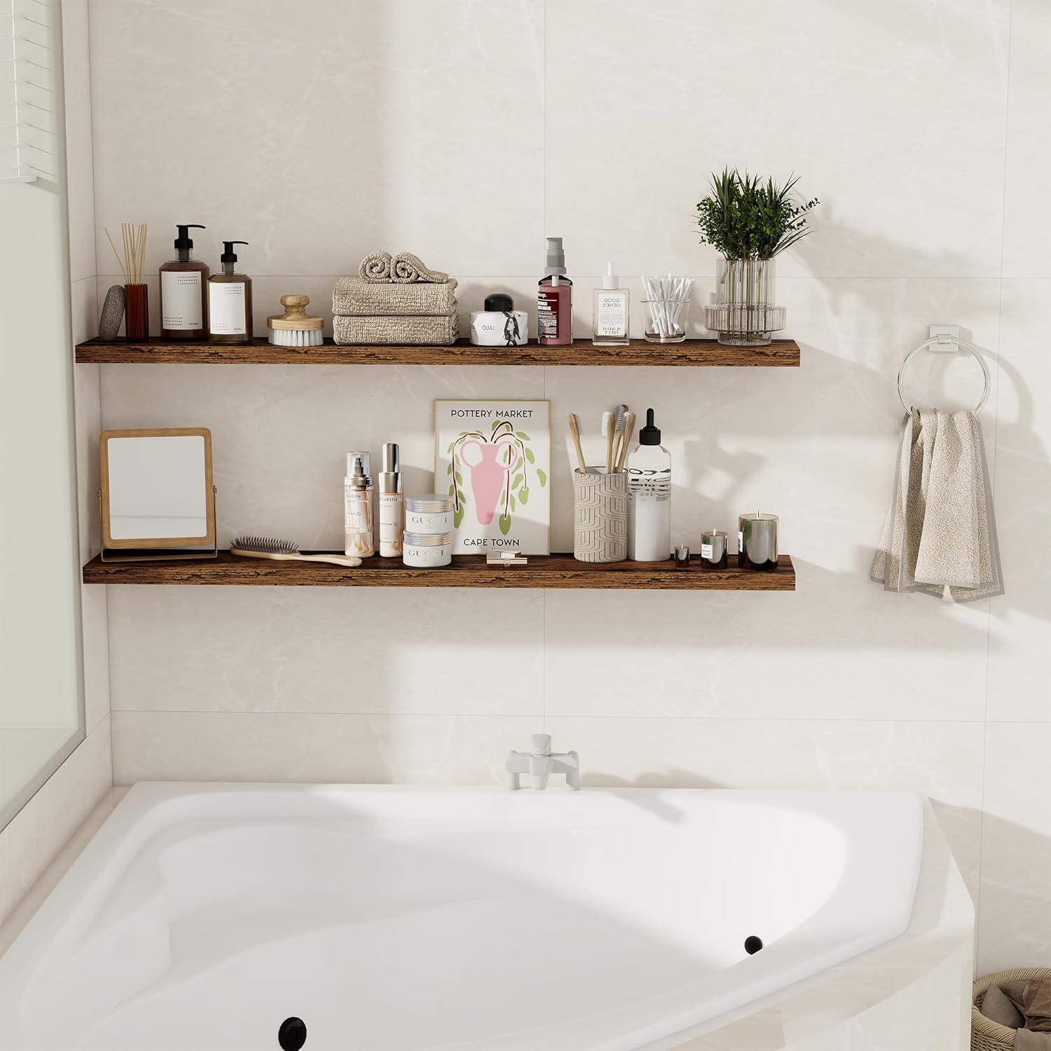 - Multi-Scene & Functional: These versatile shelves are great for any room. Use them in the bathroom for beauty products or aromatherapy, in the bedroom for books and personal items, or in the kitchen for spices and jars. They also make a stylish display shelf in the living room for photos, trophies, or collectibles. Perfect as floating bookshelves, over-the-toilet storage, kitchen shelves, or wall displays throughout your home