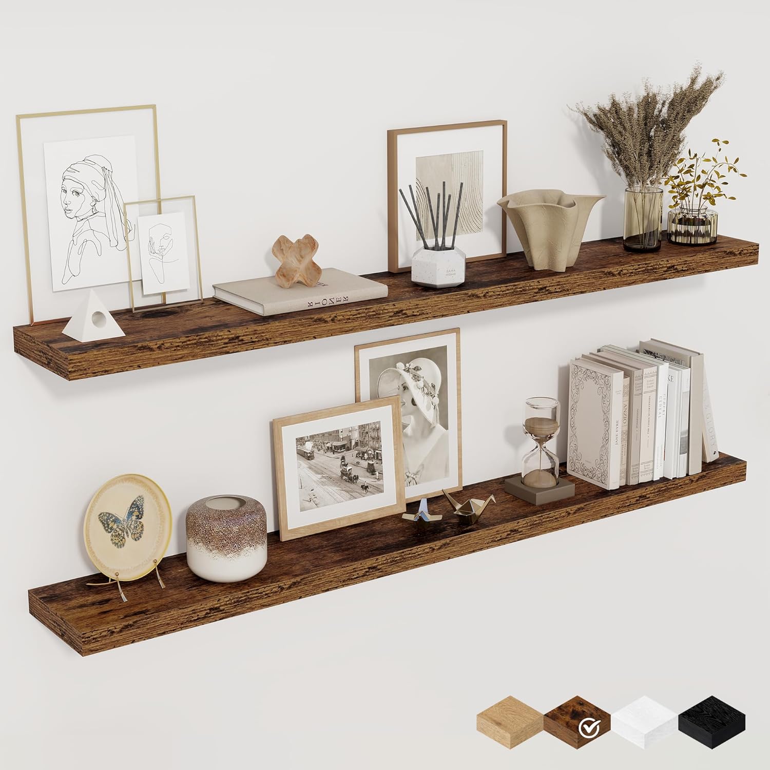 - Free Up Space in Your Home: Wooden floating shelves are perfect for displaying charming showpieces, trophies, photo frames, decorative items, and other treasured possessions—while also providing functional storage. Maximize your wall space without taking up any floor space. Enhance your home, bathroom, or living room decor by filling empty wall areas above desks, fireplaces, entryways, vanities, or between windows with stylish and practical shelving