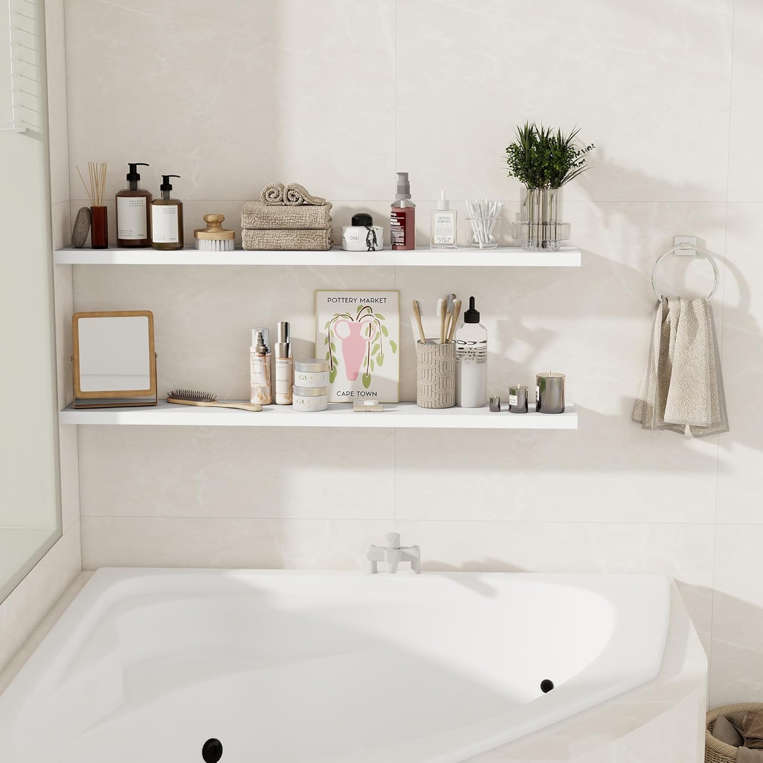 White Floating Shelves for Wall, 48 Inch Floating Shelves for Home Decor, Wall Mounted Rustic Wood Shelves, Bathroom, Hanging Deep Shelf for Bedroom, Living Room, Kitchen, 2 Packs