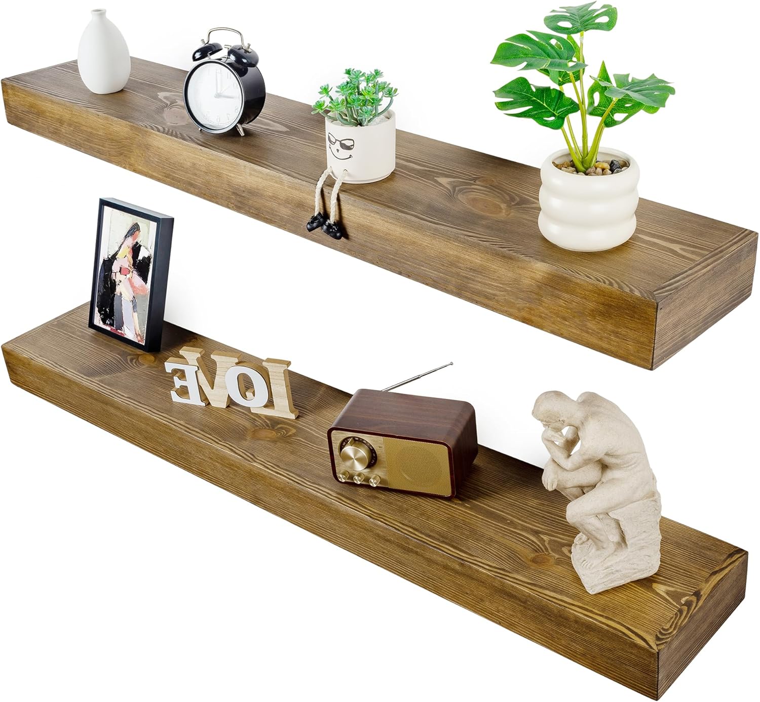 - Premium Handcrafted Solid Wood Shelves: Our floating shelves are made from 100% real solid pine wood, handcrafted to showcase the natural grain and unique knots of the wood. The rustic stain adds a timeless farmhouse charm, enhancing any home decor.