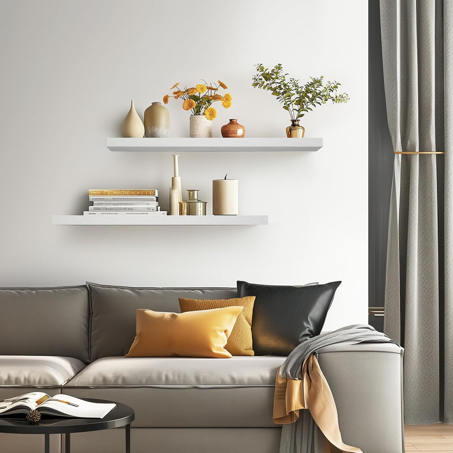 BAYKA Floating Shelves for Wall, 36 inches Long Wall Mounted Rustic Wood Shelves for Bathroom, Bedroom, Living Room, Kitchen, Office, Hanging Shelf for Books/Storage/Decor(White,Set of 2)