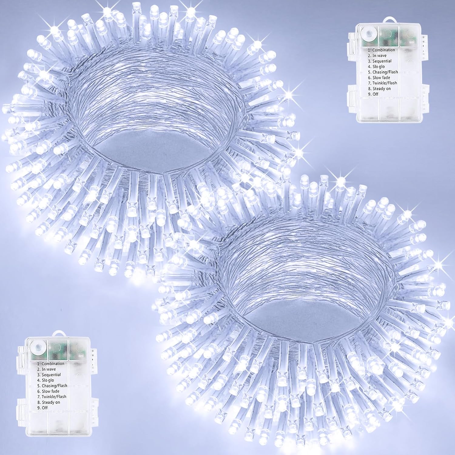 - Ultra-Bright and Durable Battery Powered String Lights: Each string light is 33 feet, features 100 super bright LEDs and a waterproof battery case with 8 lighting modes to ensure longevity and reliability. The cool white Christmas lights emit a bright, modern glow in the dark, making them an ideal choice for indoor and outdoor decorations. These fairy lights are perfect for Christmas, birthdays, parties, weddings, creating a cozy and joyful atmosphere.