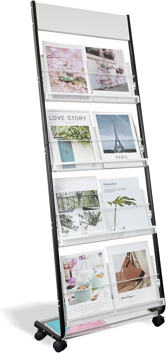 4-Tier Floor-Standing Magazine Rack with Wheels – Perfect Brochure Display Stand for Exhibitions, Offices, and Information Hubs (Black-White)