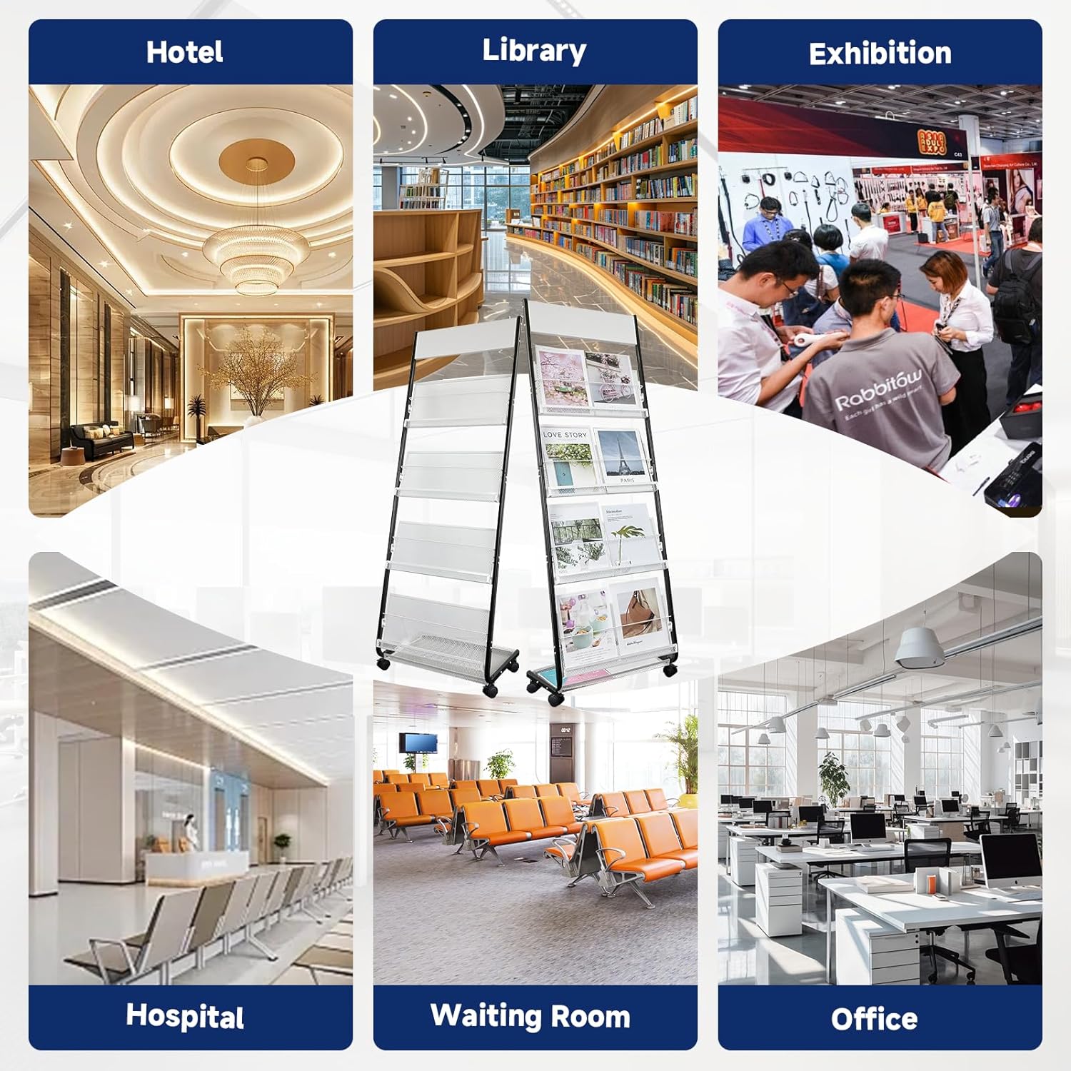 - MULTIFUNCTIONAL USE: Featuring a versatile four-tier structure along with a bottom basket, this display stand is perfect for a wide range of environments, including trade shows, exhibitions, hotels, and office spaces. It offers an elegant and systematic way to display literature and reading materials in any organizational setting.