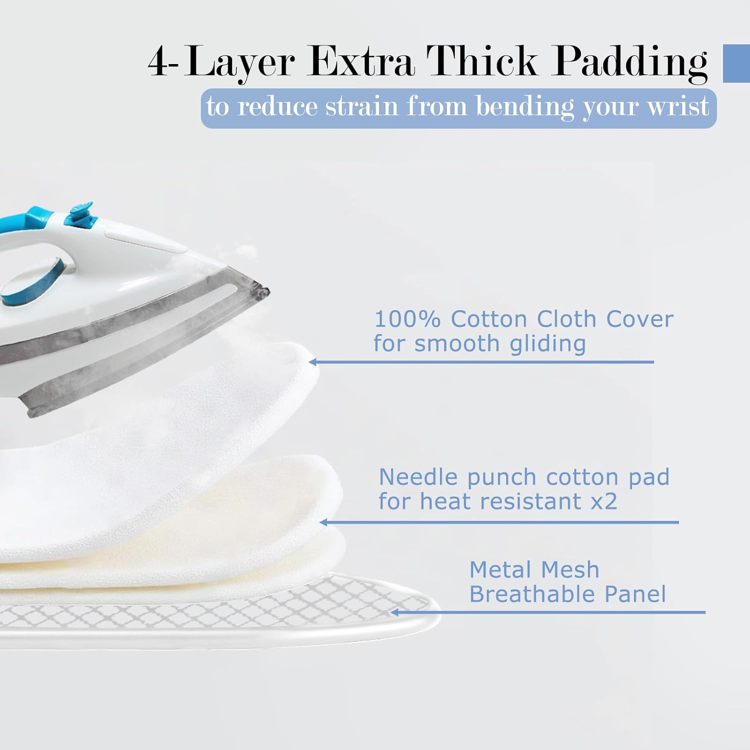 - 3-Layer Cover: ASHARE iron table's cover is made of 2 layer needle-punch cotton and l layer pure cotton, providing a good cushion for ironing while permitting the absorption of excess steam – resulting in a faster ironing process