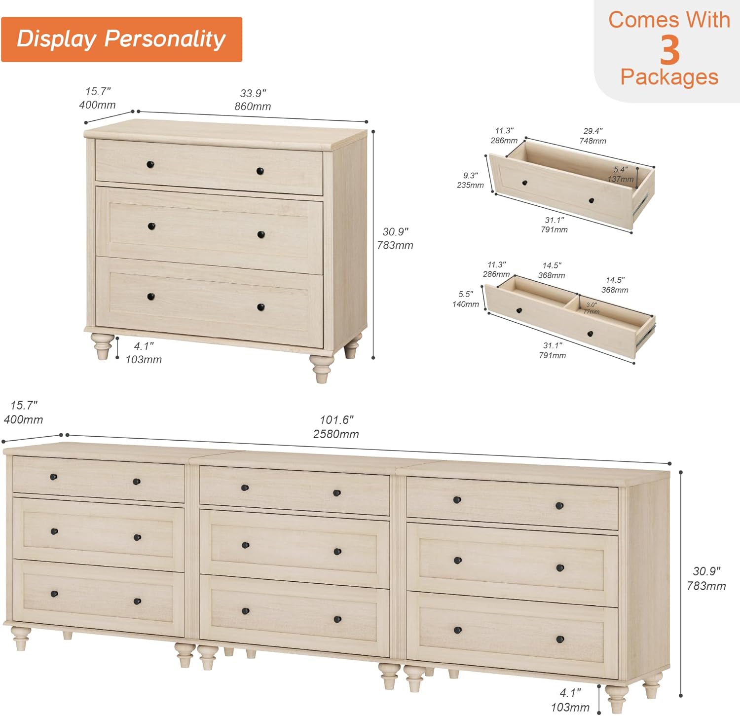 - 【3-in-1 Multipurpose Dresser】The large dresser can be used together as 9 drawer dresser or tv stand for 100 inch tv, or used separately as 3-drawer dressers.With distresser suface is very classic and elegant which blends in easily with any decor. It is ideal as a baby dresser, kids dresser and console table, etc.