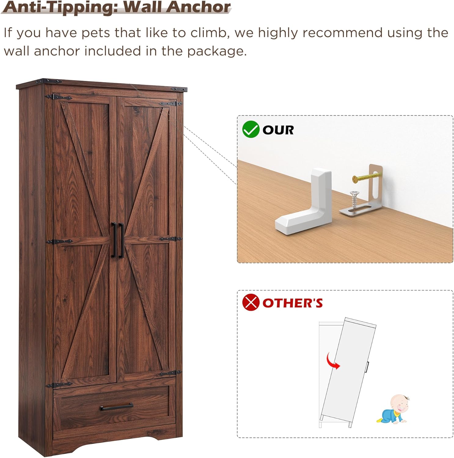 72" Tall Wood Storage Cabinet, Farmhouse Kitchen Pantry Cabinet with Adjustable Shelves & Drawer & Barn Doors, Versatile Storage for Kitchen, Dining Room, Bathroom, Brown