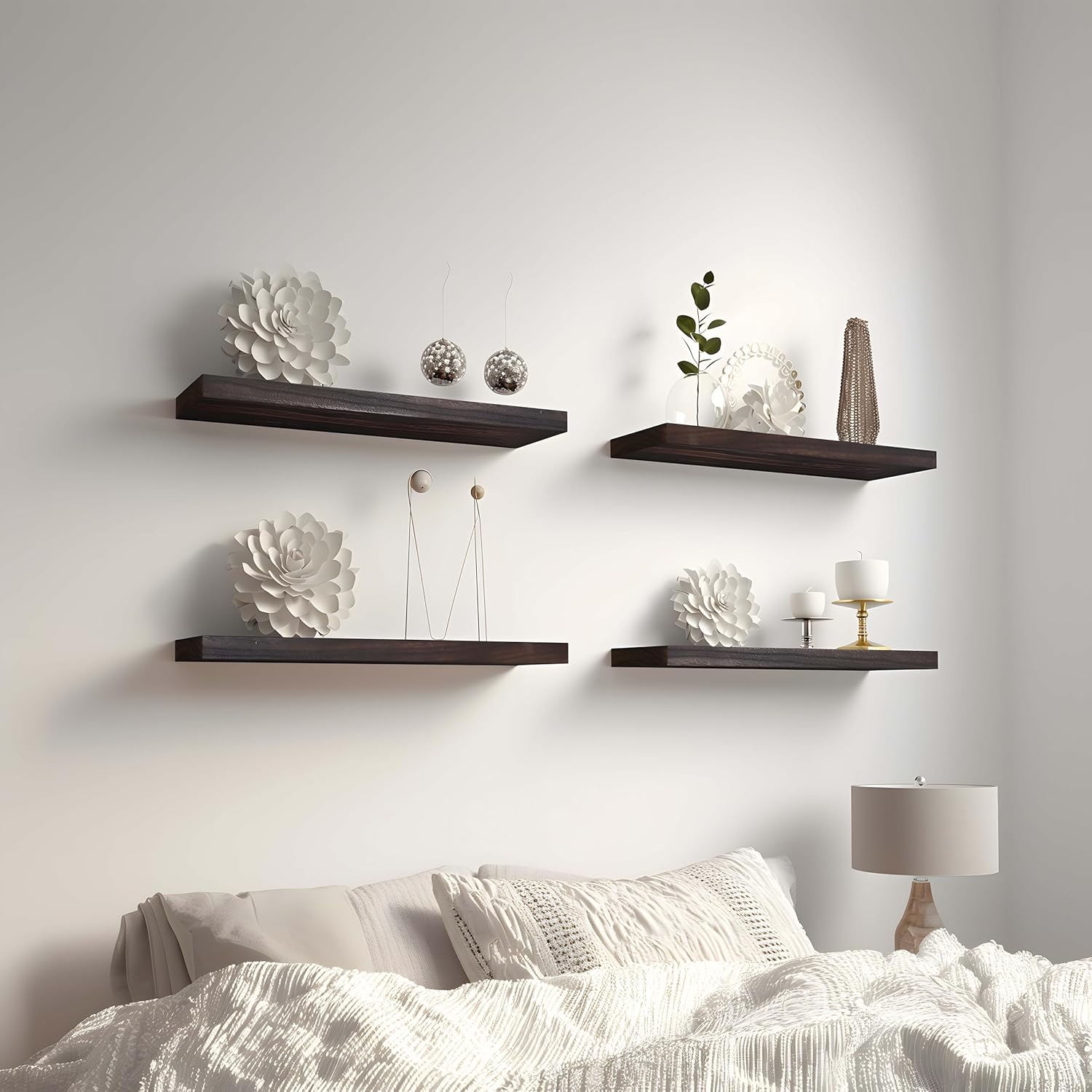 - BEAUTIFUL FLOATING SHELVES - The style and finish of these floating shelves can match almost all themes in your home. Ideal home decor to organize bathroom, office, bedroom, living room, kitchen.