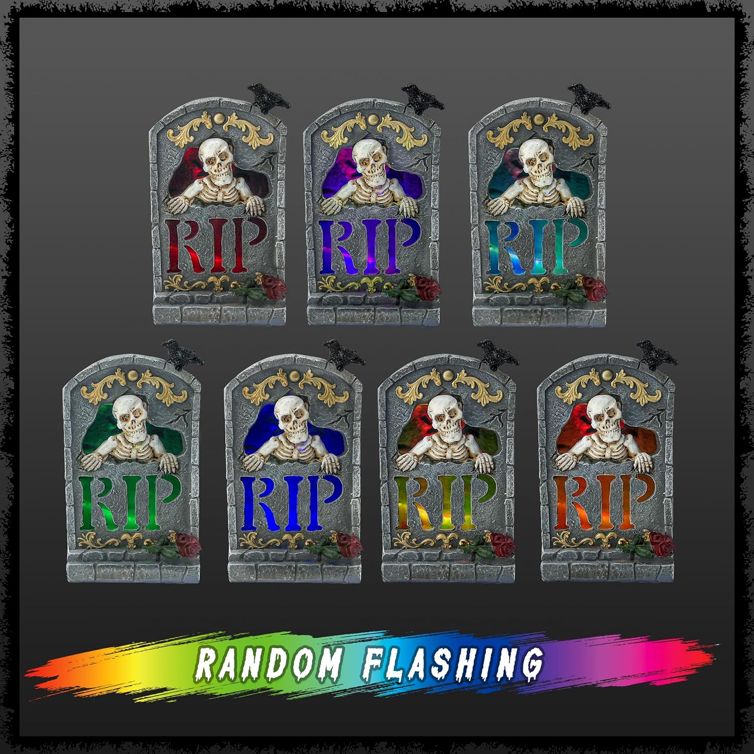 Halloween Decoration Indoor 7.6″ Tombstone Statue with LED Lights Spooky Skull Head Gravestone Skeleton RIP Lighting Changes Halloween Village for Table Shelf Home Party Outdoor Decor Gifts